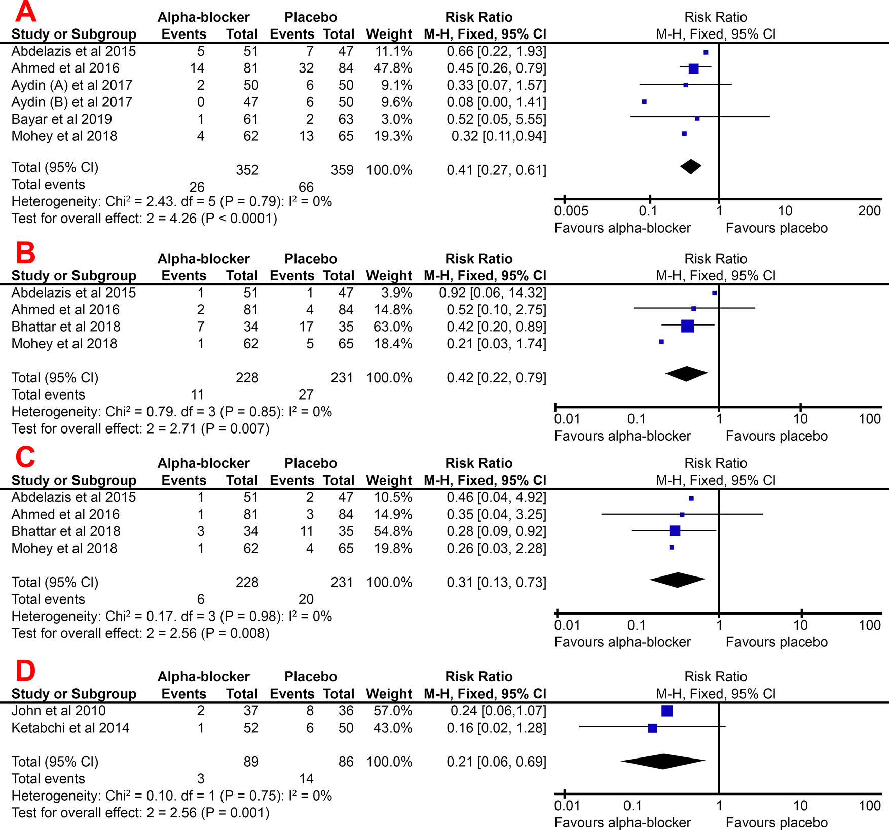 Several studies break down their patients' complications into several types of complications, such as hematuria, mucosal injury, and colic episode. For each of these complications, the alpha-blocker group was shown to have a lower risk of developing these complications. For all three types of complications, the alpha-blocker group had a significantly lower risk, with the pooled RR for hematuria, mucosal injury, and a colic episode of 0.42 (95% CI, 0.22–0.79), 0.31 (95% CI, 0.13–0.73), and 0.21 (95% CI, 0.06–0.69), respectively. These are summarized in Figure 4.