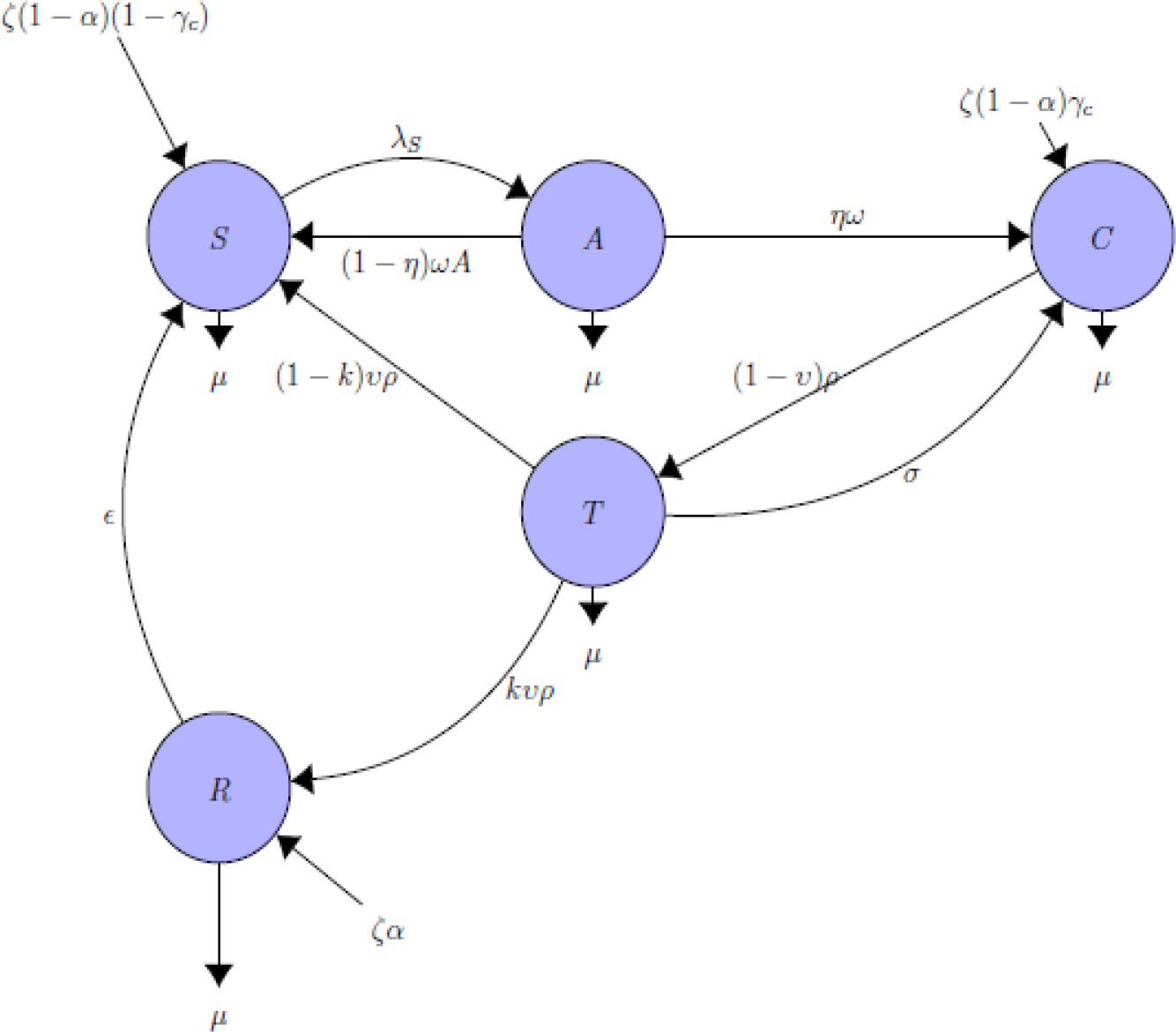 It has been clinically shown that a proportion of HBV acutely infected individuals can spontaneously clear the virus (Pan and Zhang, 2005). Also, infectious individuals under treatment can become prone to re-infection if they discontinue treatment, or consume alcohol or use of drugs, which can reduce the impact of the treatment. In view of this, the following model is developed where the population is divided into different states, namely: the susceptible, the acute, the chronic carriers, the treated and the recovered states.
