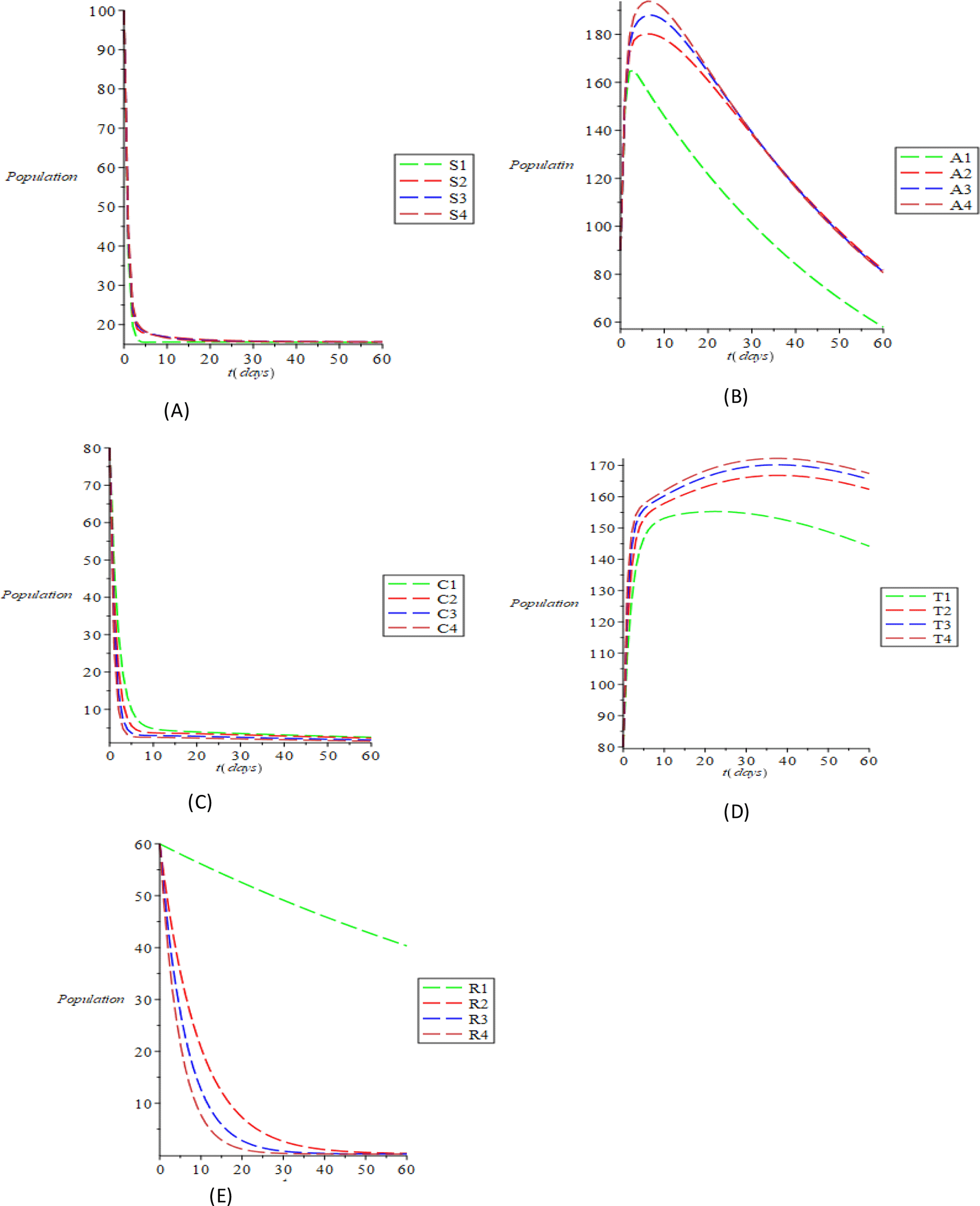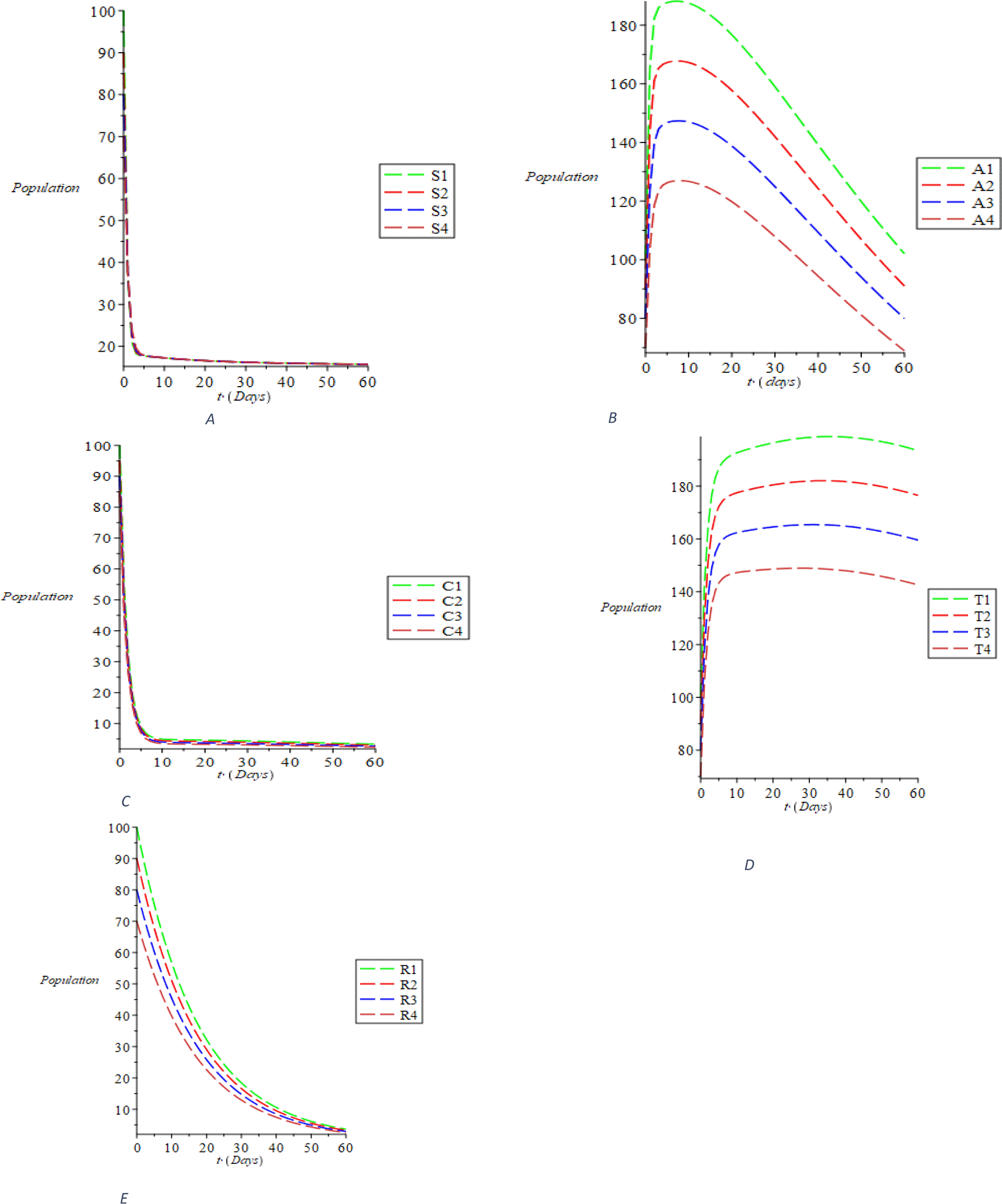 Considering the first sizes of compartmental population, taking the parameter values and the interval (0-60) using the linear stability analysis, we perform the simulations and obtain the outcomes shown in Figure 2. The dynamic behavior of susceptible individuals is represented in Figure 2A, showing the existence of the susceptible individuals. It was discovered from Figure 2B that the acute populace decreases with the passage of time. Ditto the behaviors of chronic, treated and recovered populace, respectively, are dynamically represented in Figure 2C, D and E. The trajectories S(t), A(t), C(t), T(t), and R(t) distinctly converge to the disease-free equilibrium of E0 = (S_0, 0, 0, 0, 0, R_0) = (1.678018396, 0, 0, 0, 0, 0, 0, 0.06801334973) as indicated in Eq. (10), when R0 = 0.07150316516< 1. The dynamics of the susceptible populace with respect to the treatment rate σ, recovering rate with full immunity k and the rate at which recovered individual fallout from risk reduction ϵ is shown in Figure 3A. It is evident from Figure 3A that with the increase in the parametric values, the susceptible population increases, even as increase is not evident due to those who recover with complete immunity. However, there is still an increase due to some people who fall out of risk reduction, checking the cumulative impact of the parameters causing the increment of the susceptible populations. The inverse relationship of the compartmental population (acute and chronic) with the variance of the above parameters is shown in Figure 3B and C. This means that it is possible to minimize acute and chronic individuals by increasing the parametric values. The variation of the treated and recovered populace is shown in Figure 3D and E. An increase in the treated and the recovered population is caused by increasing the values of the parameters. It can be clearly inferred from our computational simulations that treatment, spontaneous clearance and reduction of the risk factor are highly successful in transmitting and regulating HBV transmission. The effective measure of these parameters as substantiated by the simulations is an excellent control method of the transmissible infection of HBV.