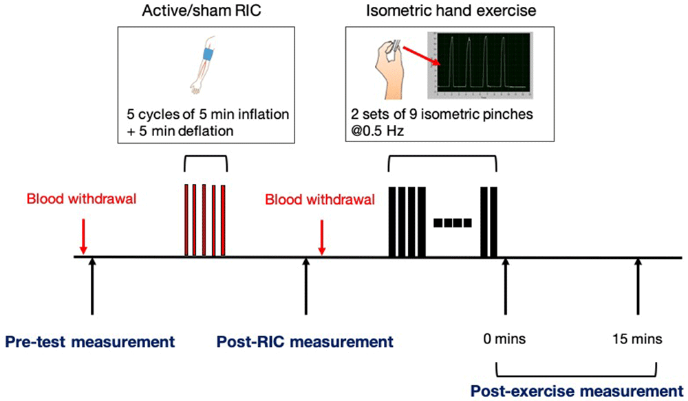 Outcomes will be measured at baseline, post-active/sham RIC (post-RIC), and post-exercise (immediately after the isometric hand exercise (post-RICx-0) and 15 minutes later (post-RICx-15)) (Figure 1).