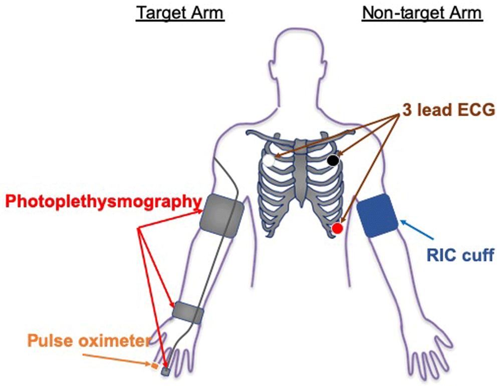 During active and sham RIC, beat-to-beat HR, BP and SaO2 will be monitored in real-time on the contralateral limb and digital signals will be stored on a computer hard-drive for subsequent analysis. A 3-lead ECG (UFI: model RESP 1, Morro Bay CA) will be used to monitor beat-to-beat HR during testing. Electrodes will be placed at the right and left clavicle and in the V-5 position; data will be recorded from V-5. Beat-to-beat BP will be continuously monitored from the target middle or ring finger using photoplethysmography (FMS: Finometer Pro; Amsterdam, Netherlands). Continuous SaO2 will be monitored with a finger pulse oximeter, placed on the contralateral hand, which will be recorded at 1-minute intervals during administration of the active and sham RIC conditions (Figure 2 shows the equipment configuration during RIC/Sham conditioning). At the fourth minute of each inflation period, participants will be asked to report any pain (on a scale from 0 to 10), discomfort, or other symptoms. Participants will be asked again at the first minute of the following deflation period to check if the pain, discomfort, or other symptoms persist.