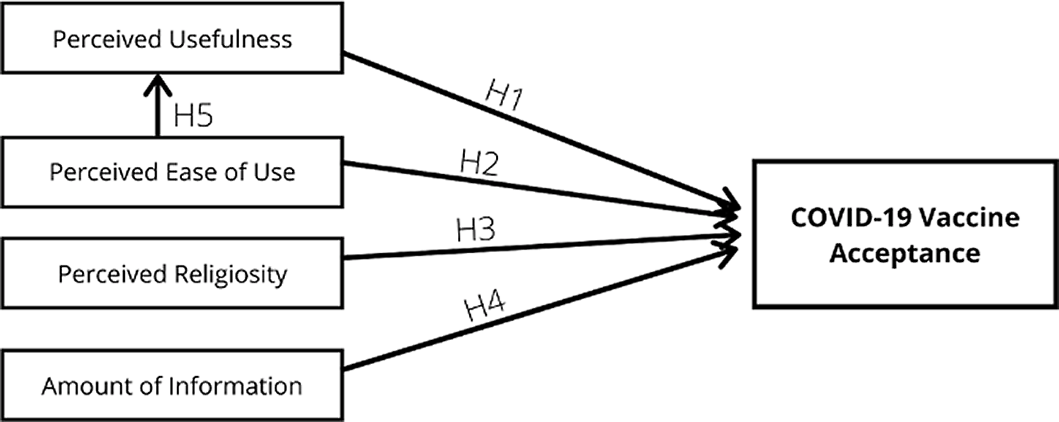 A previous study modified the TAM model to assess the customers’ acceptance26 where perceived religiosity, amount of information, perceived usefulness, and perceived ease of use were used to evaluate customers’ acceptance.26 In our proposed TAM model, we included four explanatory variables: (1) perceived usefulness; (2) perceived ease of use; (3) perceived religiosity; and (4) amount of information that might affect the acceptance on COVID-19 vaccine. This study also sought to assess whether perceived ease of use influenced the perceived usefulness. The constructs of the proposed TAM model are presented in Figure 1. The proposed model consisted of five hypotheses: (1) perceived usefulness influences the vaccine acceptance (H1); (2) perceived ease of use influences perceived usefulness (H2); (3) perceived religiosity influences the vaccine acceptance (H3); (4) amount of information on COVID-19 influences perceived usefulness (H4); and (5) perceived ease of use influences the perceived usefulness (H5). SEM modeling was used to assess the relationship between the variables. The goodness of fit of the model was measured using: (1) absolute best fit (degree of freedom (df) and root mean square error of approximation (RMSEA)) and (2) incremental goodness of fit (goodness of fit index (GFI); adjusted goodness of fit index (AGFI); minimum discrepancy per degree of freedom (CMIN/DF); Tucker-Lewis index (TLI); and comparative fit index (CFI)). The relationship between the variables in the hypotheses were interpreted based on the value of regression weights. A significant relationship was indicated as p < 0.05 and the critical ratio of each relation should be higher than 2.00.