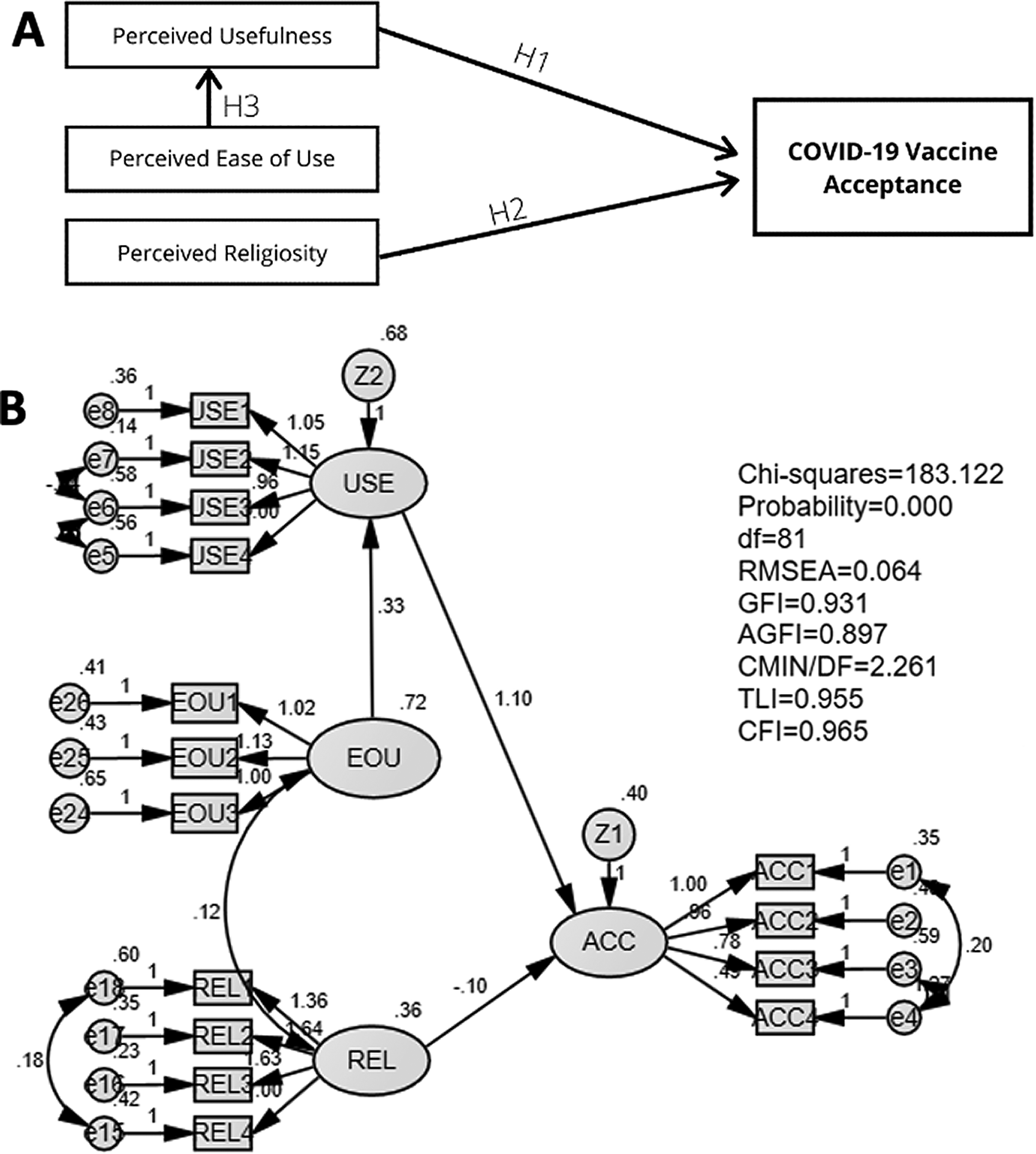 The results of SEM analysis of the modified model are shown in Table 4. Our data suggested that perceived usefulness significantly affected the acceptance for a COVID-19 vaccine (p < 0.001). Data revealed that perceived religiosity did not significantly affect the vaccine acceptance (p = 0.217). Lastly, SEM analysis indicated that perceived ease of use significantly affected the perceived usefulness (p < 0.001).