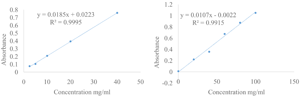 Total phenol, flavonoid and antioxidant activity were measured in S. platensis with no treatment (SP), S. platensis treated with freeze-dried O. basilicum (DSB), S. platensis treated with microencapsulation freeze-dried O. basilicum (MSB) and O. basilicum leaf extract (B), plot of standard calibration of gallic acid (left) quercetin (right) (Figure 1). Phycocyanin content was measured in SP, DSB and MSB, and then encapsulation efficiency was measured on total phenol, flavonoid, antioxidant activity and phycocyanin. The results of the One Sample Kolmogorov Smirnov Test and Levene’s Test were more than (P > 0.05) thus, the data were normally or homogenously distributed. Therefore the data analysed by the One Way ANOVA were less than (P < 0.05) and are shown in Table 1, followed by the post hoc Tukey HSD (Table 2–Table 6). The DSB sample can increase the total phenol 49.50% and antioxidant activity 12.66% of S. platensis. However, total flavonoid is not significantly different with O. basilicum intervention on S. platensis (Figure 2).