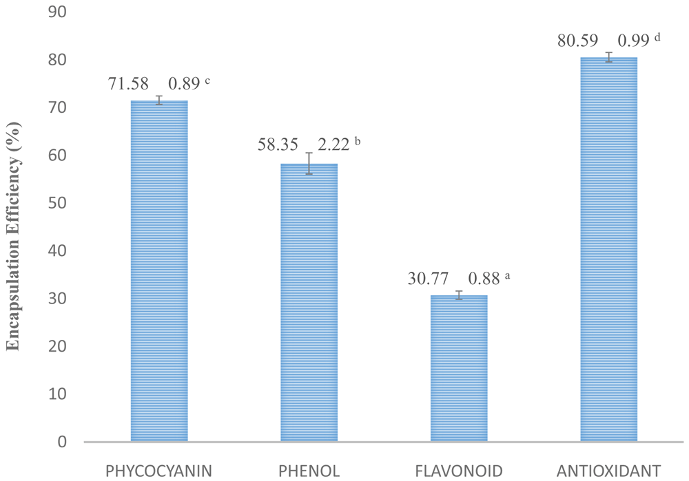 Encapsulation efficiency is used to evaluate the success of a microencapsulation technique. Encapsulation using a combination of polyanion and polycation coatings such as maltodextrin and gelatin has a higher yield. This is due to the stability of the emulsion between maltodextrin and gelatin71. The amount of bioactive content on the surface will reduce the value of encapsulation efficiency. This will cause the amount of bioactive compounds that are wrapped to increasingly shrink because many are attached to the surface. So that this event will damage the oxidative stability of microcapsules72. The encapsulation efficiency of phycocyanin was in accordance with the results of previous studies73, which is encapsulation using an alginate coating has an encapsulation efficiency value of 71.75%. The value of encapsulation efficiency in total phenols and flavonoids in S. platensis is effected by using liposomes or nanoliposomes in encapsulation of bioactive compounds, this is because liposome is stable at low pH and is able to withstand the time of release in the stomach, but it is less consistent in the intestine74,75. The encapsulation efficiency of antioxidant has been shown in previous research where antioxidant microencapsulation using the freeze drying method has an encapsulation efficiency value ranging from 73–86%76.