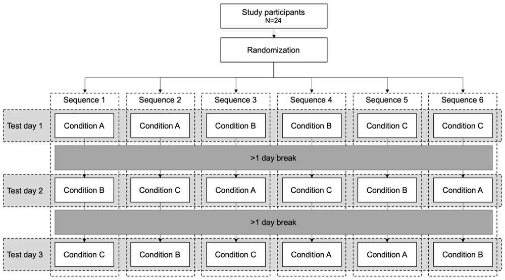 Experimental design. We used a block randomized crossover design as implemented in our previous study45. Conditions were block randomized by the project manager in two blocks of all possible condition orders per sex to prevent a potential systematic condition effect (Figure 2). Participants were enrolled by the project manager. Sealed envelopes were drawn from a container (one container per block) by the tester. Blinding to the experimental condition was not possible because of the obvious differences between conditions (partial weight bearing and additional load). However, the person processing the data was blinded to the condition. Because it does not seem feasible that a subject can actively alter the load-induced changes in blood markers of articular cartilage, it was assumed that this approach is appropriate for answering the research questions.