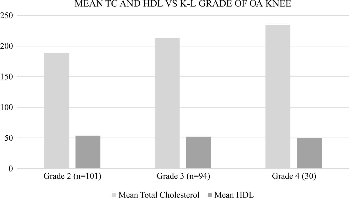 Similarly, patients with Grade 3 knee OA had a mean TC and HDL value of 213.66 and 51.99 respectively. And patients with Grade 4 knee OA had a mean TC and HDL value of 234.90 and 49.30 respectively.