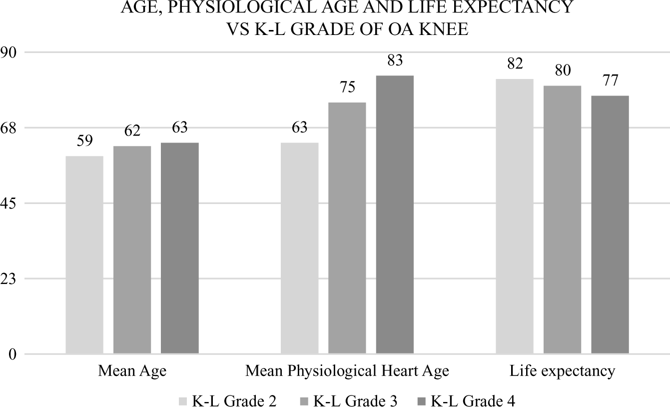 This JBS3 risk score calculator gave us three parameters about the cardiovascular condition of the heart, i.e. physiological heart age, 10-year risk in percentage of developing a CVD and life expectancy provided any other cause of death is ruled out. Statistically significant results were obtained when studying the severity of knee OA with heart age and life expectancy. Physiological heart age came out lesser but life expectancy higher for patients with a lower grade of knee OA. As we go up the K-L grade of knee OA, the physiological heart age went up and the life expectancy came down (Figure 11).