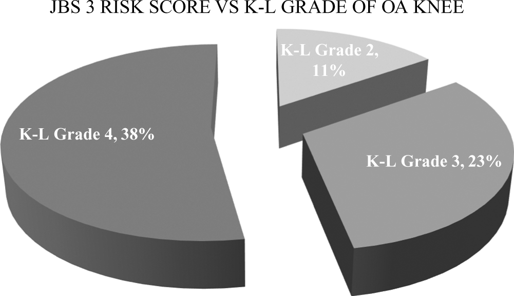 With JBS3 risk as dependent variable there is significant difference when all the three grades of OA knee are compared with each other. OA = osteoarthritis; HS = highly significant.