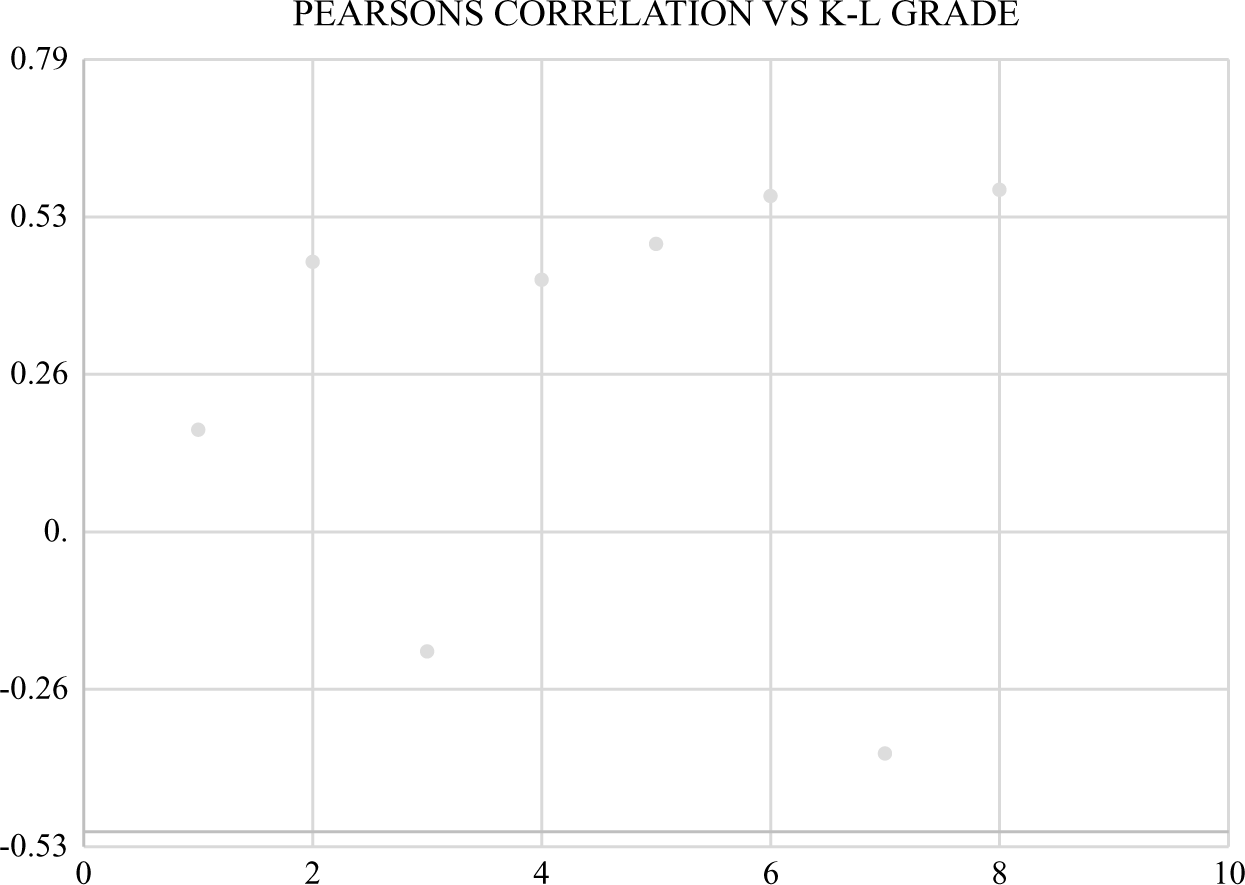 The Bonferroni post hoc analysis of K-L grade with the JBS3 risk score as the dependent variable showed multiple comparisons of each K-L grade with the others as statistically significant (Table 5). The ROC curve showing area under the curve of sensitivity vs specificity of grade 4 vs 2 and 3 for risk score is depicted in Figure 13. According to ROC analysis for the JBS3 risk score, it was determined that patients with K-L grade 4 knee OA were more likely to run a 10-year risk of developing CVD at minimum 14% with sensitivity of 72.3% and specificity of 66%. Pearson’s correlation was derived, showing a positive correlation between K-L grade and JBS3 risk score with a correlation factor of 0.57 (p < .01). Similarly, a positive correlation was seen with age, TC, SBP, BMI, and physiological heart age. A negative correlation is seen with HDL and life expectancy (Figure 14).