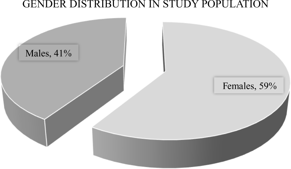 A total of 225 patients visiting the orthopedics OPD with complaints of knee pain took part in the study.32 All participants were over 50 years of age with more than half (53%) of them between the age of 50-60 years (Figure 1). The majority of these patients were females (59%) (Figure 2). As per the BG Prasad socioeconomic scale (SES),15 the majority of them belonged to either the middle or lower socio-economic group (Figure 3).