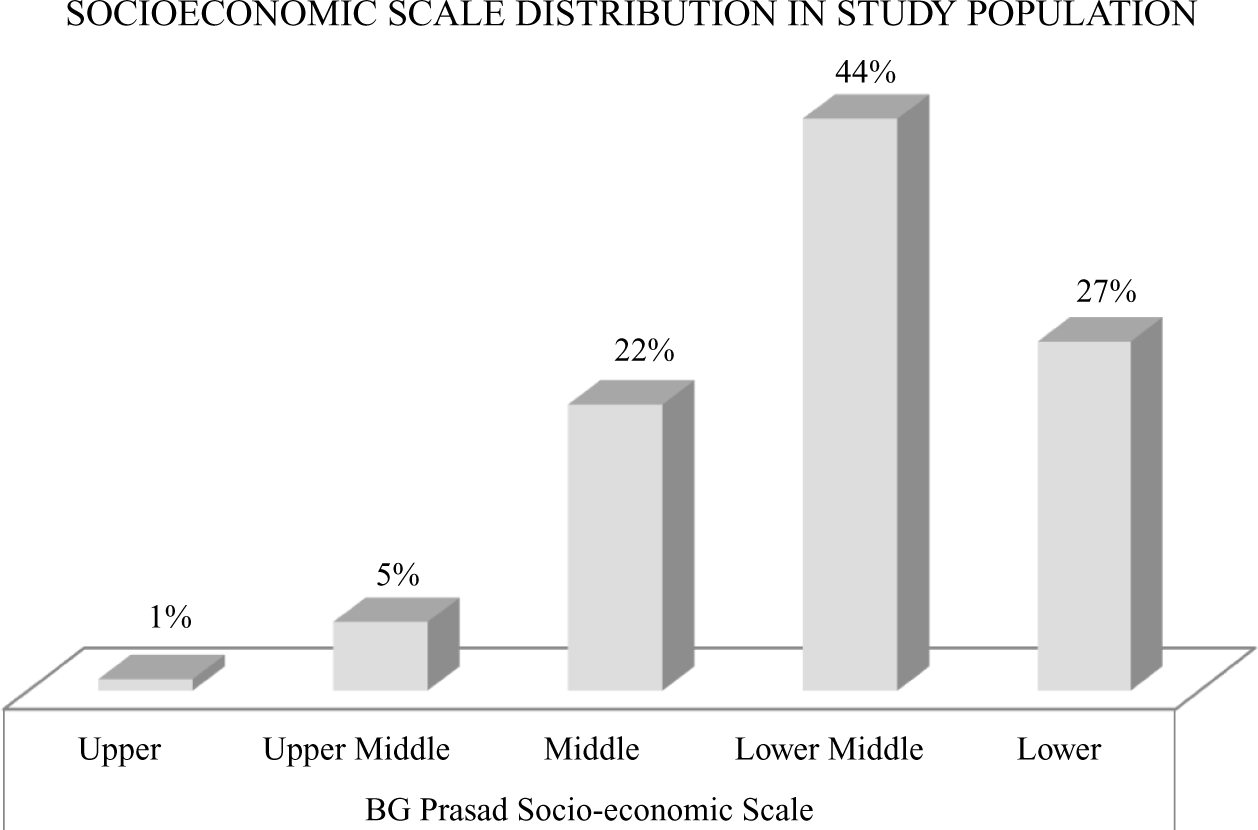 44% of the study population belong to the lower middle class and 27%, 22%, 5%, and 1% belong to lower class, middle class, upper-middle-class, and upper class, respectively.