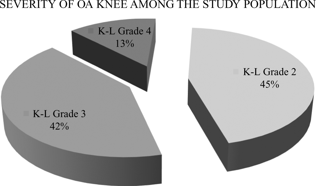 45%, 42%, and 13% of the study population had grade 4, grade 3, and grade 2 of K-L classification of knee OA, respectively.