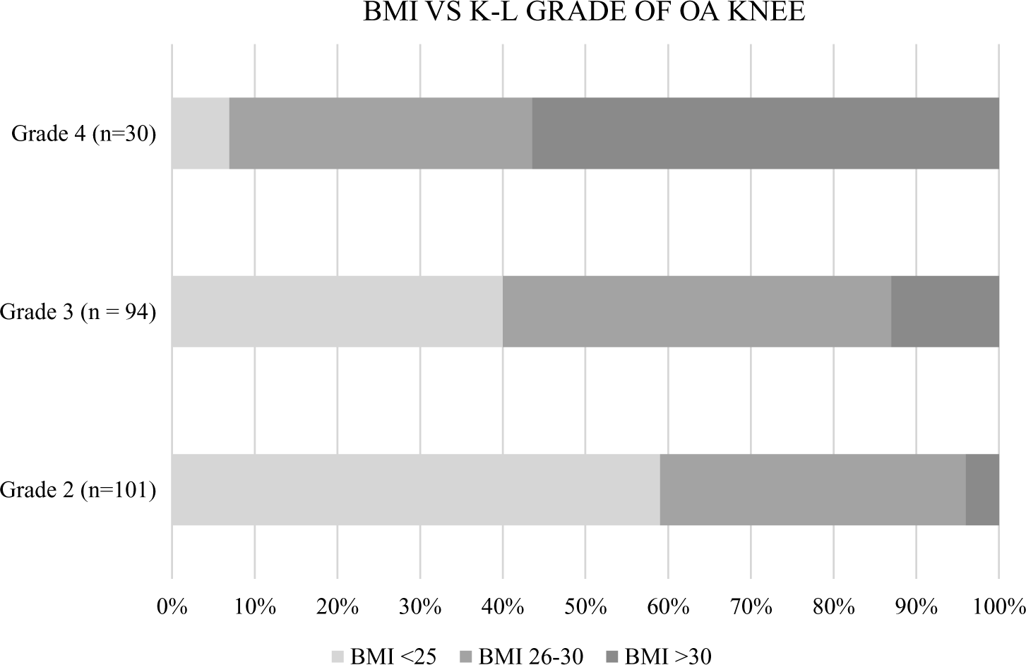The Fishers exact test was used to find out the statistical significance of the relationship between socioeconomic status and knee OA grade, which was found to be highly significant (p value<.01). Chi square test, when applied to compare knee OA grade with age {X2(4, 225) = 3.801, p = .434} or gender {X2(2, 225) = 1.016, p = .602}, was not found to be statistically significant. A one-way ANOVA test was applied to K-L grade of knee OA with BMI and found to be highly statistically significant {F(4,225) = 60.652, p < .01}. An increasing trend in the BMI of patients was noted with a higher grade of knee OA, e.g. 60% of grade 2 knee OA patients had a BMI of less than 25 as compared to 40% in grade 3 and only 7% in grade 4. In addition, 57% of patients with grade 4 knee OA had a BMI of more than 30 as compared to 13% in grade 3 and only 4% in grade 2 (Figure 6).