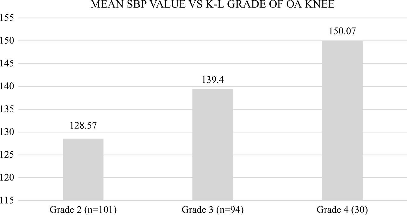The mean systolic blood pressure (SBP) was 128mmHg, 139mmHg and 150mmHg for participants with grade 2, grade 3 and grade 4 knee OA, respectively.