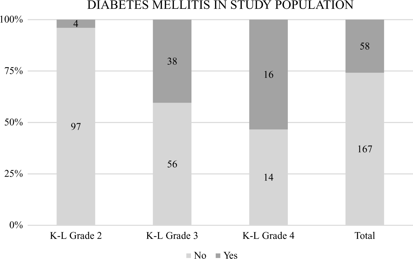 Of the 225 participants, 88 had a SBP reading of 140 or more, out of which 28 (33%) were not taking any antihypertensive medication. In total, 25.8% of the entire sample had a history of diabetes mellitus (DM), which is much lower than more than half (53%) of patients with grade 4 knee OA. Of grade 3 patients, 40% had DM, yet of grade 2, only 4% had DM. This was found to be statistically significant {X2(2, 225) = 47.574, p < .01} as per the chi square test. Figure 8 depicts the comparison between each grade of knee OA and diabetes mellitus.