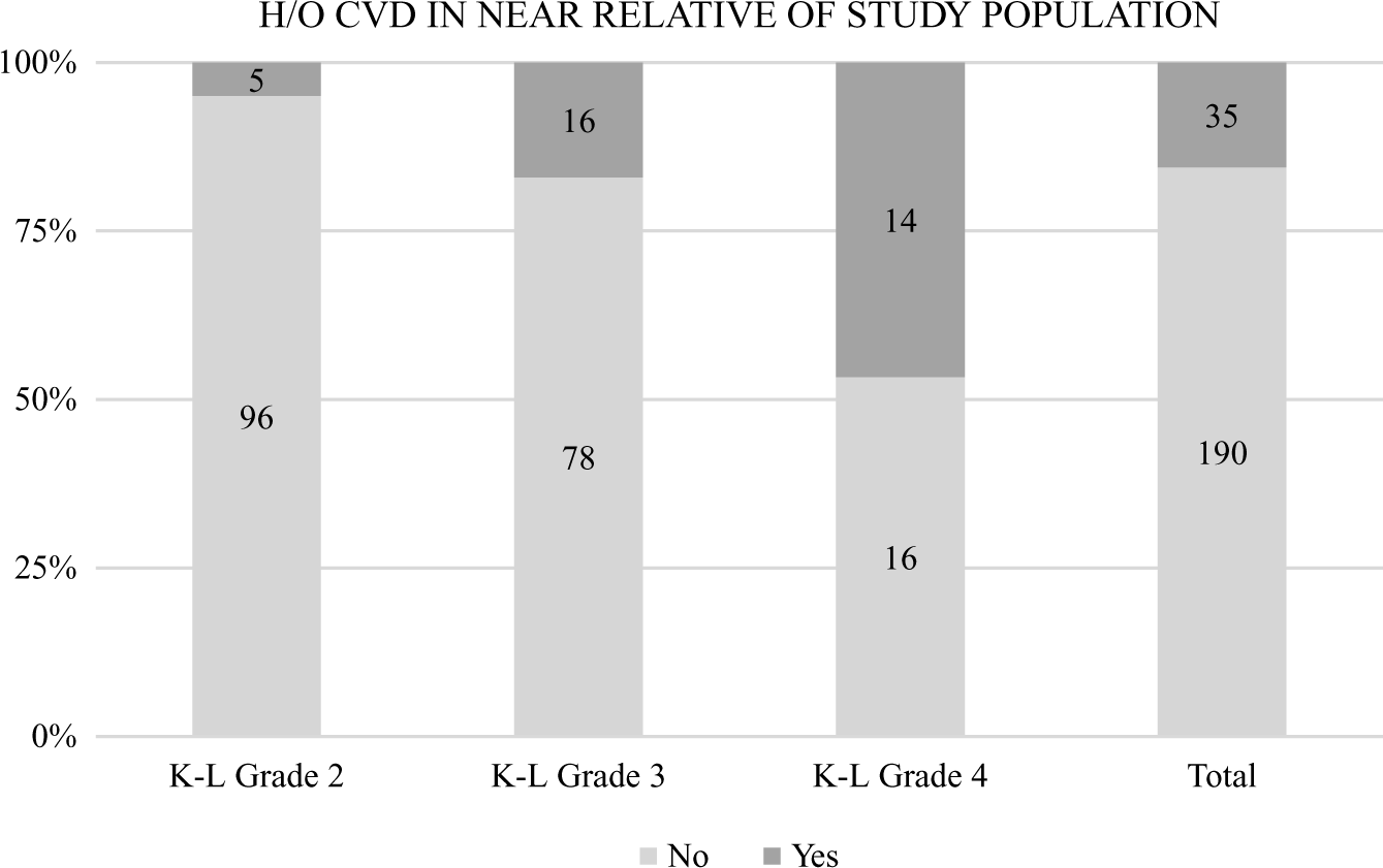 Similar trends were seen in the history of CVD among the relatives of the study population. A total of 35 (15.5%) patients gave a history of their relatives suffering from CVD in the past. Compared by grade, 46.7% of the patients with grade 4 knee OA gave a positive relative CVD history as compared to only 17% and 5% of the patients with grade 3 and 2 knee OA, respectively (Figure 9). The chi square test for this difference was statistically significant {X2(2, 225) = 30.907, p < .01}.