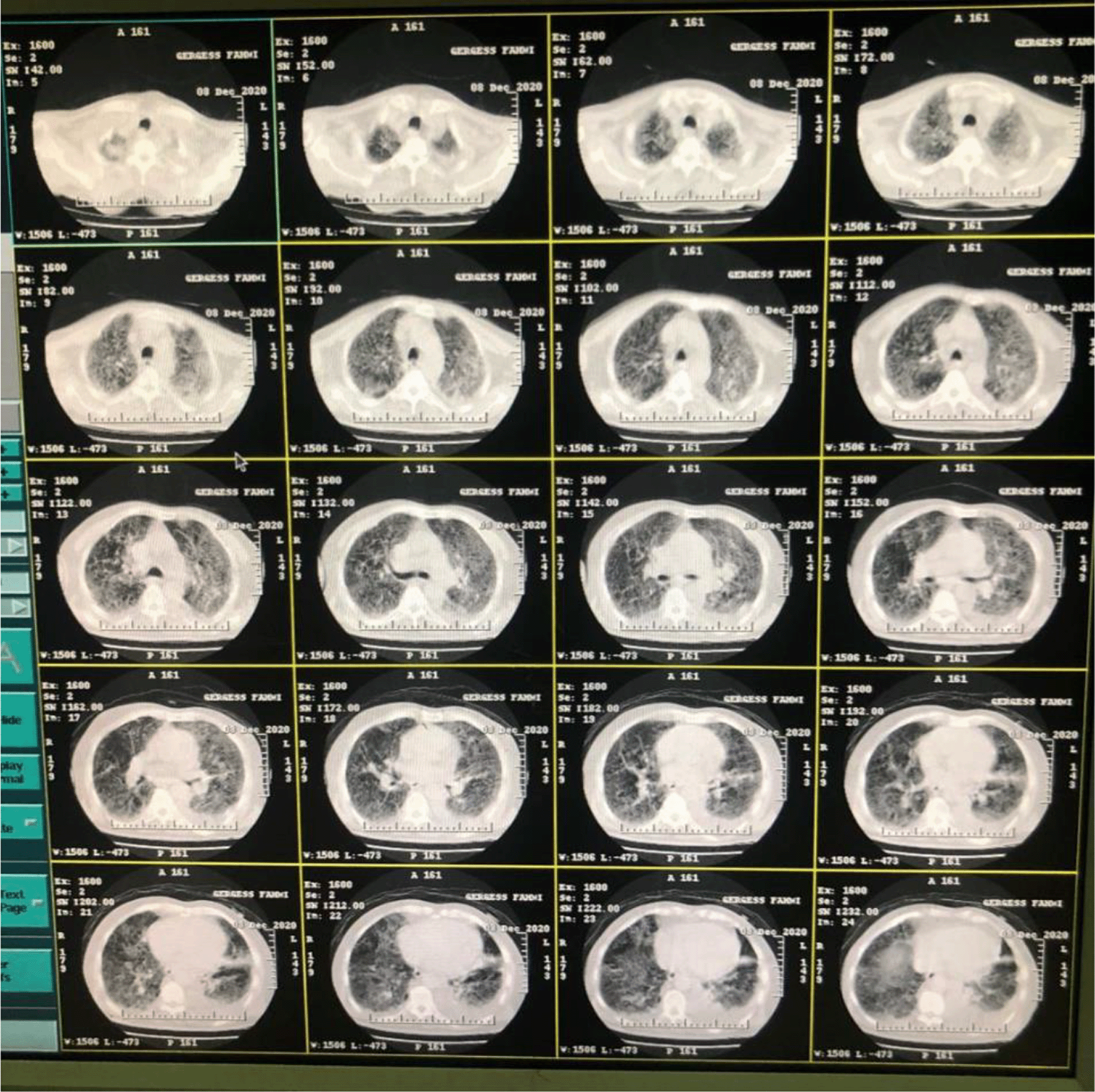 Chest computed tomography was done for the patient on the first day of hospital arrival, 8 December, shown in Figure 1.