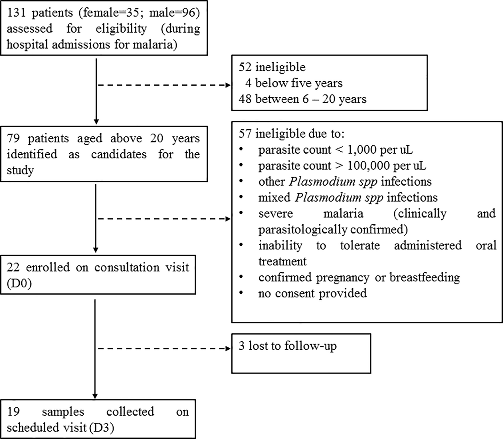 A total of 131 patients (female=35; male=96) with slide-confirmed malaria infection were admitted at the three out-patient hospital sites during the study period.24 From these, 79 patients aged above 20 years (female=23; male=56), were identified as candidates for the study.24 However, 22 patients (female=8; male=14) who met the other inclusion criteria were enrolled in the study on the consultation visit (Day 0) (Figure 1). For all enrolled patients, microscopic examination and rapid diagnostic testing of P. falciparum mono-infection was conducted on the consultation visit and on the subsequent scheduled visits. Oral tablets of AS-AQ were prescribed once a day for three consecutive days, according to the treatment regimen. Treatment administration after Day 0 (D0) was unsupervised on D1 and D2, and sample collection was scheduled on D3. On the scheduled visit (D3), 19 blood samples (AQH=10 samples; KH=3 samples; GBH=6 samples) were successfully collected, while three patients (female=2; male=1) were lost to follow-up (Figure 1).