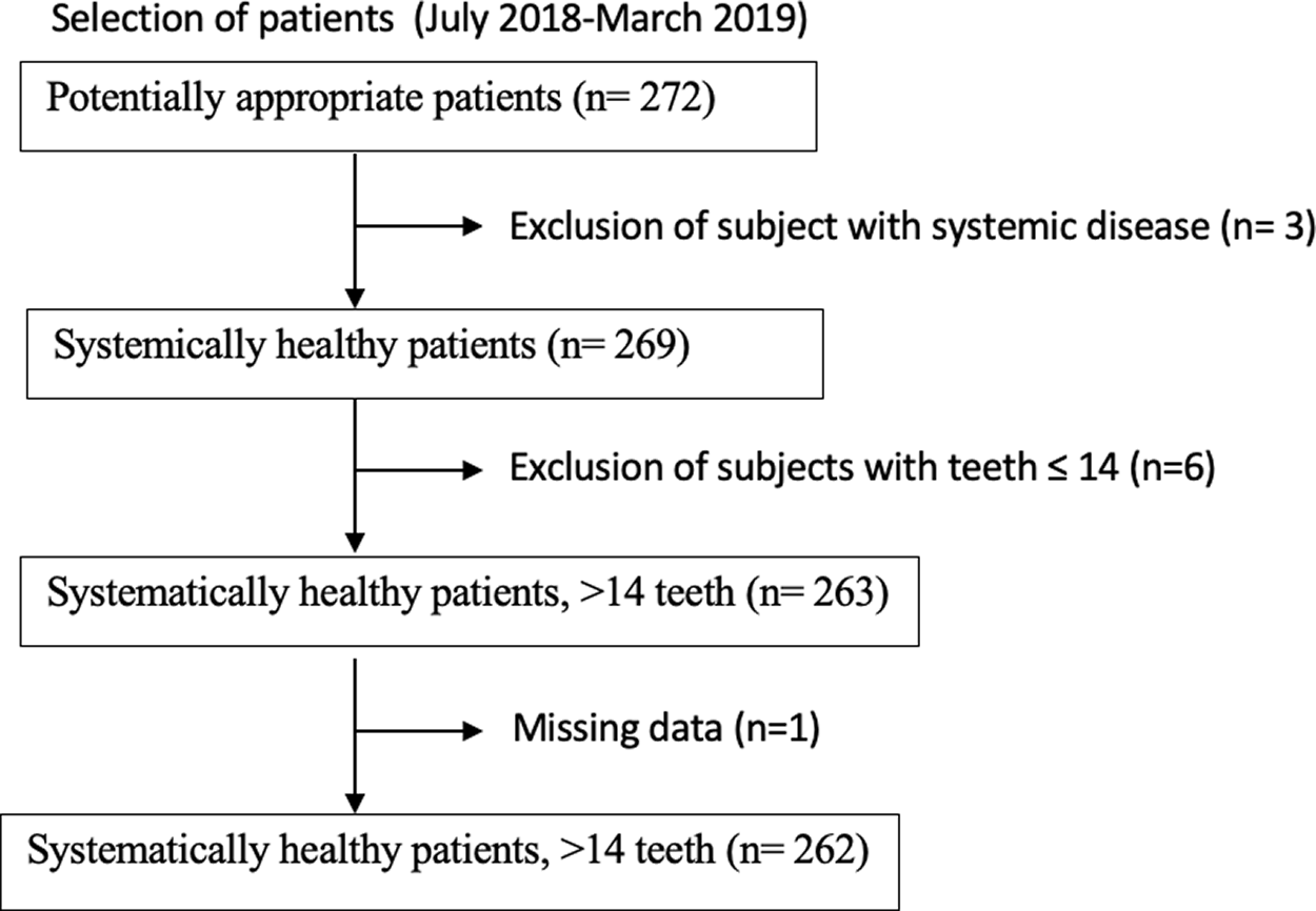 A total of 272 subjects were recruited; however, some subjects were not eligible according to the inclusion criteria: such as having fewer than 14 teeth, or age. Missing data were excluded (Figure 1). Therefore, a total of 262 subjects between the ages of 18 and 66 were included in this study. The percentage of female subjects was larger (59.9%) than male subjects (40.1%) as presented in the general profile (Table 1). The age group of 45-54 made up two fifths of the sample size, whereas the fewest subjects were in the 25-34 years age group. Subject’s education status was mostly high school (53.4%) and the primary occupation was housewife (47.3%). The subjects were mostly non-smokers (79.4%) and non-alcohol-consumers (93.5%). 50.8% of subjects had either healthy periodontal scores or mild periodontitis, and the rest had moderate or severe periodontitis.