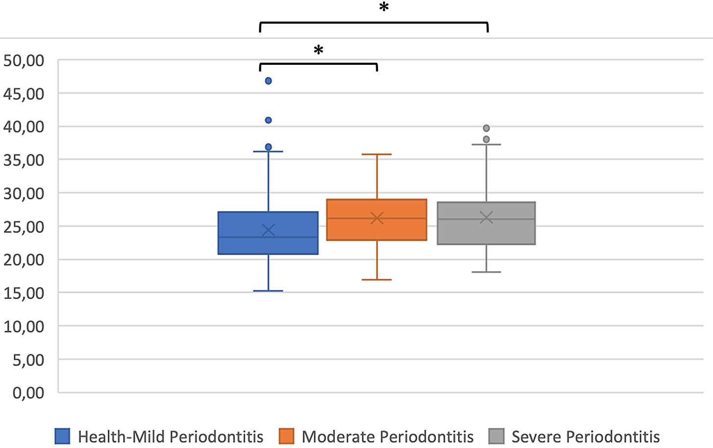 | Moderate periodontitis | 54 | 20.6 | 26.17 (6.03) | ||