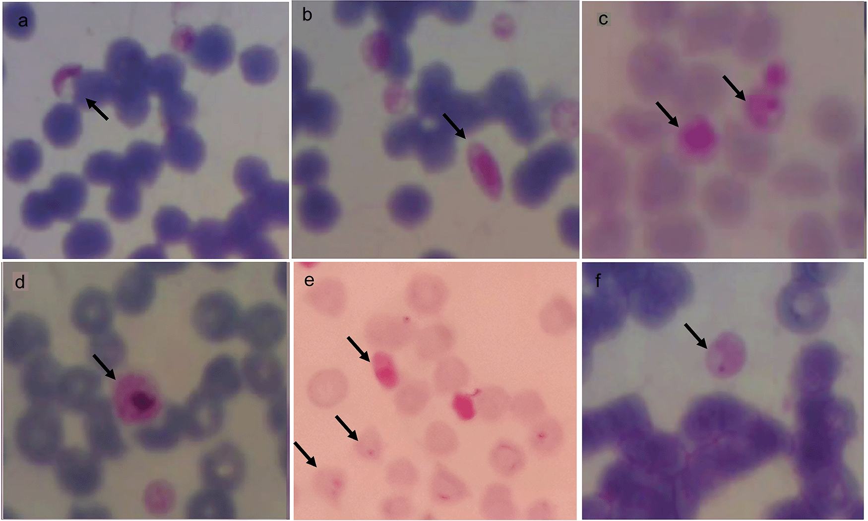 Microscopically, trophozoites, schizonts, and gametocyte forms at 100× magnification can be seen in Figure 5. P. falciparum gametocytes found in buffaloes were sausage and crescent-shaped (a, b), while schizonts found in horses were smaller or the same size as the red blood cells (c). The P. vivax gametocyte was larger than the red blood cells found in buffalo (d). P. falciparum gametocyte and trophozoites (ring-shaped) with one or two nuclei was found in goats (e) and P. falciparum trophozoite found in horses had one nucleus (f).