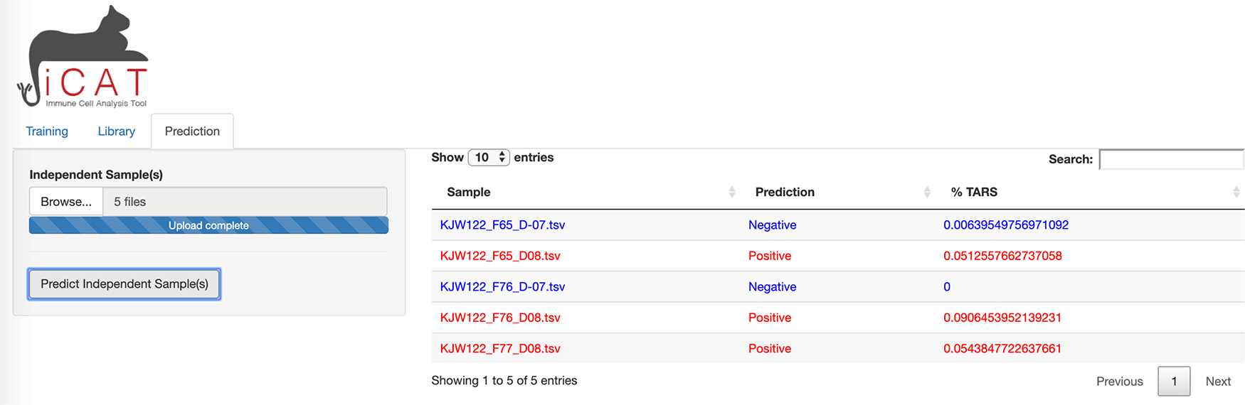 To allow the diagnostic classifier to test independent cohorts of samples, a third tab in iCAT, “Prediction” tab, also unlocks after training and allows the user to upload one or more independent TCR-sequencing samples for classification using the parameters generated by the training data (Figure 4). The “Prediction” tab allows the user to diagnose unknown samples (e.g. not included in the previous training data) for classification as “Positive” or “Negative” and determining the accuracy of the diagnostic assay. Use the Browse button to upload such independent samples for prediction. Multiple samples can be uploaded simultaneously. Click Predict Independent Sample will analyze the dataset. A table will appear after analysis is complete. The table displays sample names along with the prediction ”Positive” (red) or ”Negative” (blue), and displays the %TARS that is the percent of individual sequences from the sample that are included in the TARS library. The prediction results can be downloaded as a table.
