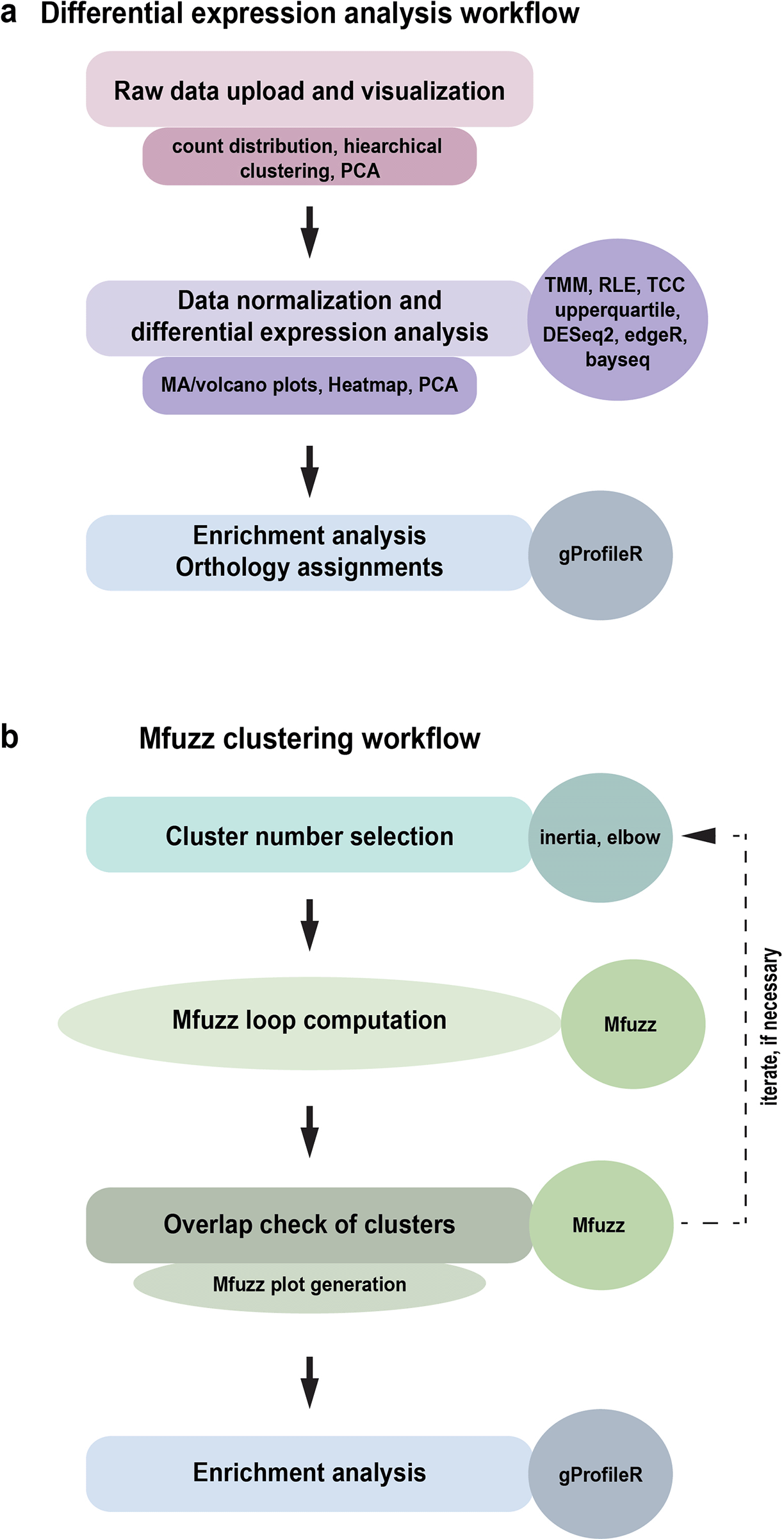 (a) RNA-seq differential expression analysis workflow with the three main parts: data upload and visualization, data normalization and differential expression analysis, as well as enrichment analysis and orthology assignment. The types of analyses are shown, as well as the various possible R programs provided for data analysis. (b) Mfuzz workflow for clustering of time-series RNA-seq data. The workflow includes the selection of cluster numbers, checking the overlap of Mfuzz clusters, loop calculations of Mfuzz, Mfuzz plot generation, as well as enrichment analysis of Mfuzz clusters.