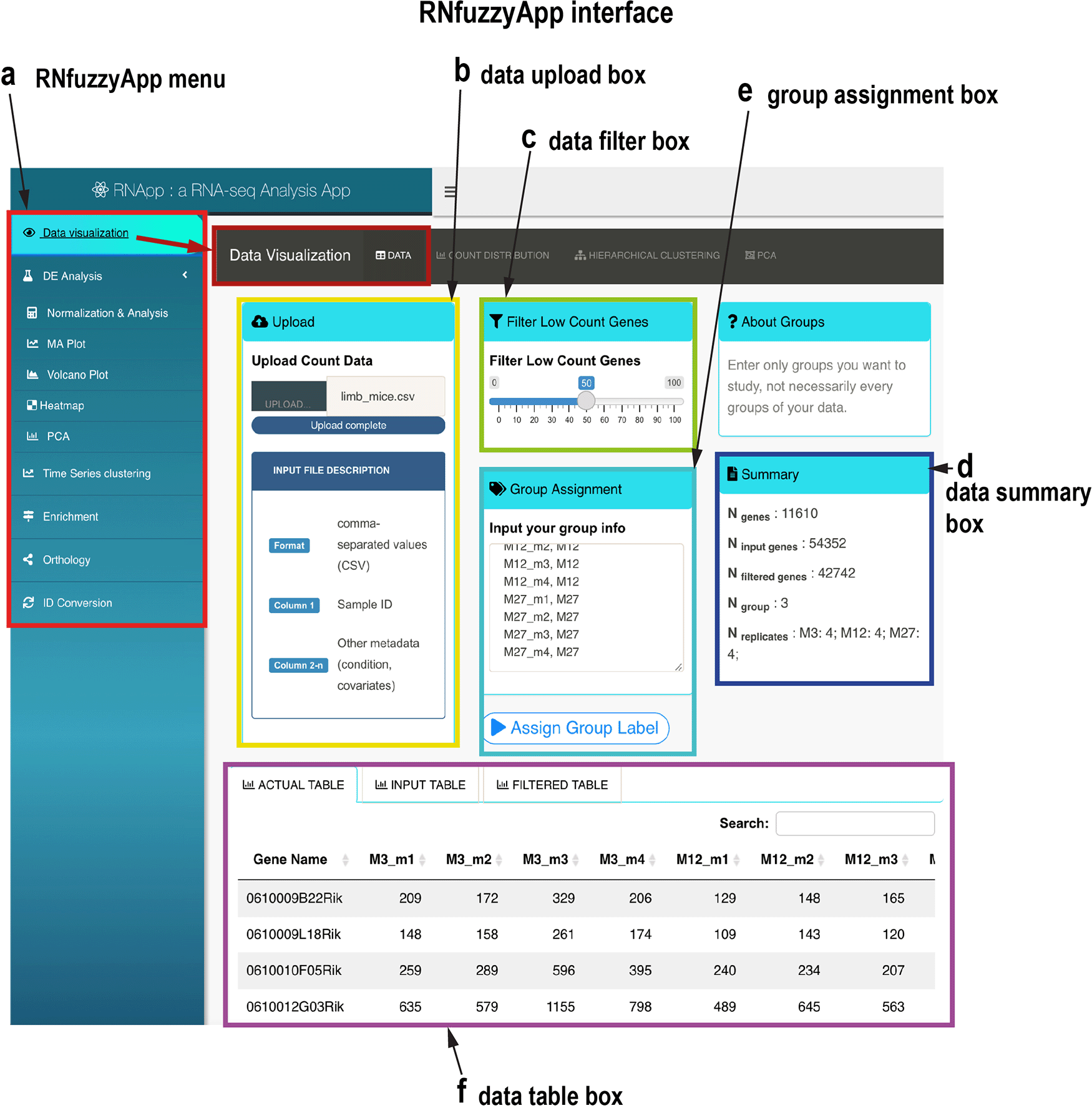 (a) The RNfuzzyApp menu box is highlighted in red. This box is shown consistently over all interfaces and links to Data visualization, DE analysis, Data normalization and analysis, different visualization possibilities (MA plot, Volcano plot, Heatmap and PCA), Time series clustering (using the pipeline for Mfuzz soft clustering), Enrichment analysis, Orthology assignment, as well as ID-conversion. The main interface shown here belongs to Data visualization (highlighted in dark red). (b) Data upload box, for upload of user-provided data. (c) Data filter box, in which the user can choose to filter out genes with low read counts. (d) Group assignment box, in which the user has to assign the groups (e.g. wild-type and mutant, or different time-points) to the data. (e) Data summary box. The data shown in this box are updated and in case of filtering and are renewed on the fly. (f) Data table box. Three tables are provided: the actual table, including genes that were not discarded due to filtering; the input table, containing all data uploaded; finally the filtered table, containing genes that were removed due to filtering.
