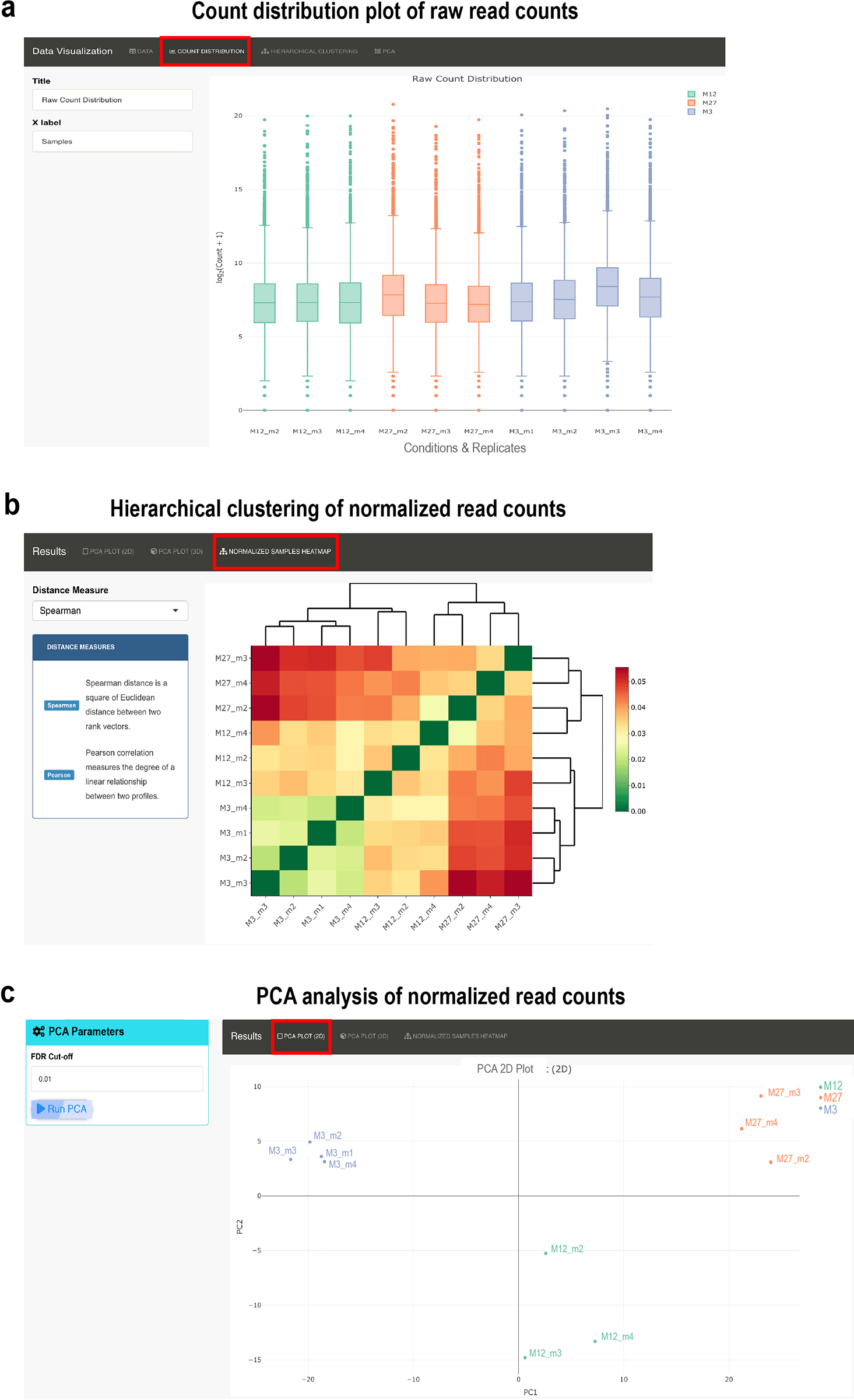 We used data from the Tabula muris senis project for demonstration purposes. (a) Count distribution plot of mice from 3 months, 12 months and 27 months. Only replicates from male mice were chosen. Data are grouped by condition. The title of the plot, as well as the X-axis label can be chosen by the user. Raw read counts were chosen for visualization. (b) Hierarchical clustering of normalized read counts. Spearman correlation was used for clustering. (c) PCA plot of normalized read counts. The PCA plot can be visualized in 2D or 3D. DESeq2 was used for normalization of data.