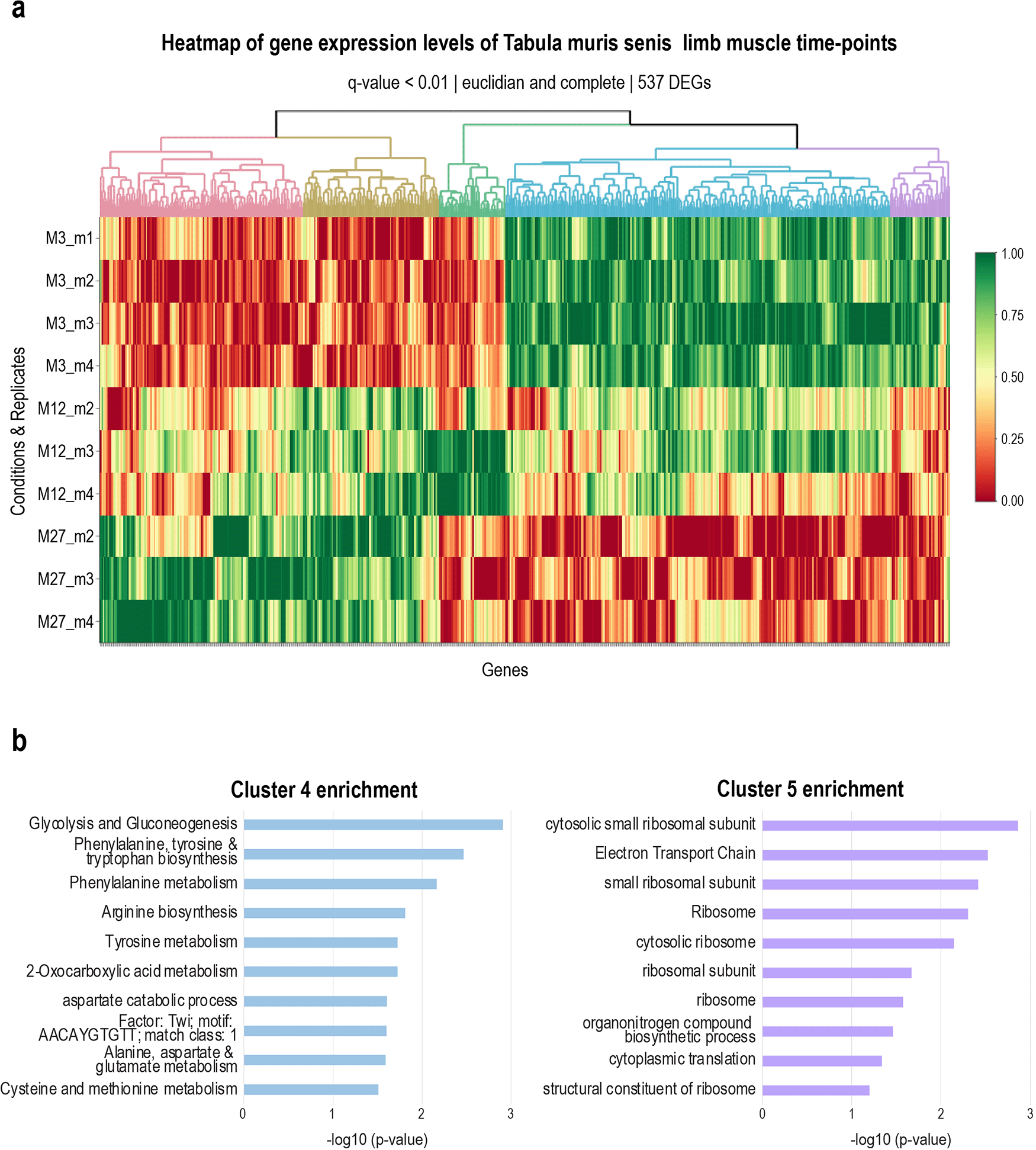 (a) Heatmap of gene expression levels of the Tabula muris senis limb muscle data. Only significant genes were selected for plotting, with an FDR cutoff of 0.01, resulting in 624 DEGs. These DEGs could be clustered in 5 independent clusters, indicated by different colours in the dendrogram. (b) Enrichment analysis results for cluster 4 and cluster 5 of the limb muscle heat map. In cluster 4, processes related to energy and amino acid metabolism are enriched. Genes belonging to this process have a higher expression level in young versus old mice, suggesting more active metabolism in young muscle cells. In cluster 5, processes related to translation are enriched, whereby associated genes have higher expression levels in young muscle versus old muscle. The minus log10 of the p-value of the enriched process is plotted.
