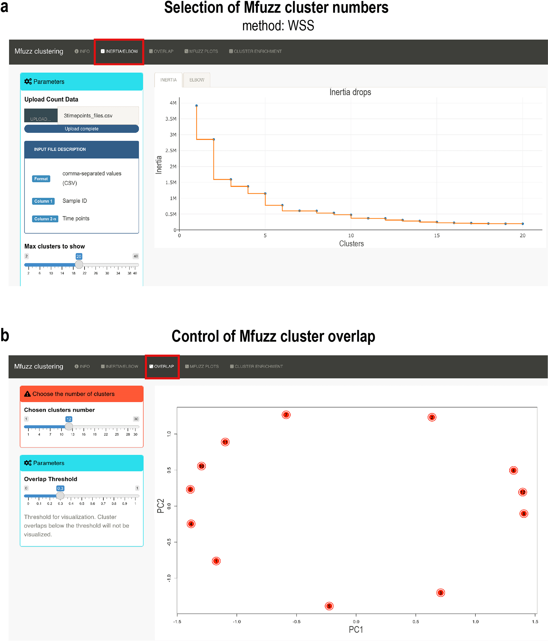 Fuzzy clustering of time-series expression data is a highly useful technique for analysing temporal data. The Mfuzz package from R was developed for soft clustering of temporal gene expression data.8 Starting from a count matrix, genes are clustered according to their expression profiles over time. As Mfuzz is a soft clustering algorithm, a gene can in theory be part of more than one cluster. Mfuzz, however, is not straightforward to use for non-experts. First, a number of clusters must be chosen prior to clustering. Second, repeated Mfuzz runs will result in slightly different cluster memberships of genes. A user is therefore well advised to repeat Mfuzz clustering several times to test the robustness of the clustering. The decision, which cluster number is suited for the data then often includes analysis of cluster overlaps, as well as enrichment analyses of clusters and comparative analysis between several chosen numbers of clusters. Several packages exist to help decide on cluster numbers and the entire workflow for a successful Mfuzz clustering can be programmed in R. However, for untrained bench scientists, this is not easily done. We therefore included the complete workflow of Mfuzz soft clustering of time-series expression data in RNfuzzyApp (Figure 1b): first, for choosing the right cluster number, we implemented the inertia (using the hclust and dist packages) and elbow (using the e1071 package) methods. Inertia performs hierarchical clustering and plots the dendrogram, indicating the distance steps (height) against the number of clusters. Ideally, a cluster number is chosen when the drop in height gets minimal (Figure 5a). The elbow method looks at the total of the within-clusters sums of squares (WCSS) as a function of the number of clusters. The “elbow” shape is formed when WCSS is minimal. These two methods should converge to help choose the right number of clusters. After Mfuzz clustering has been performed, the overlap of clusters can be checked. To do so, the overlap.plot function from Mfuzz is used and results can be visualized (see Figure 5b). After choosing a suitable number of clusters, Mfuzz is run ten times in a loop to test the robustness of clustering results (Figure 1b). Membership lists of the ten Mfuzz clustering runs can be downloaded and checked for robustness. Plots are generated using the mfuzz.plot function and are also downloadable (Figure 6a). Should core clusters be unstable, this entire process can be repeated. Finally, enrichment can be done on Mfuzz cluster gene lists, using gprofiler2 (Figure 6b).