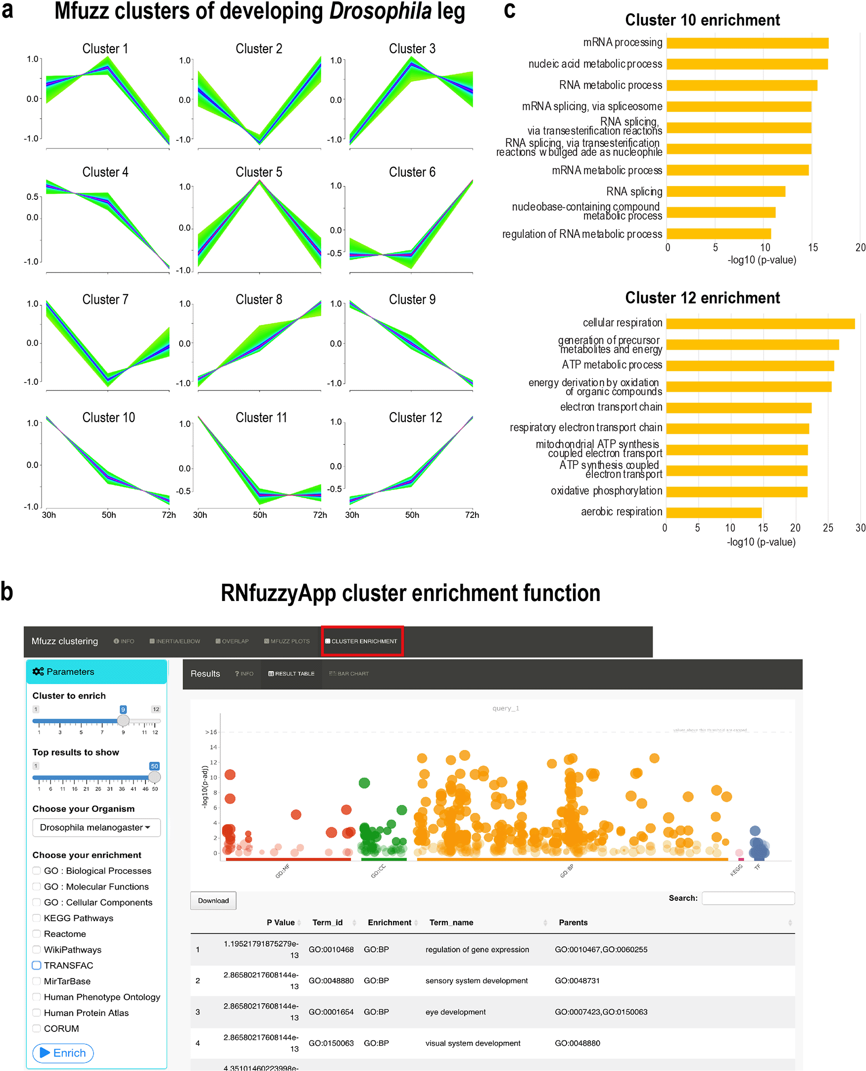 (a) Mfuzz clusters of Drosophila leg developmental RNA-seq data. Some similar patterns emerged, with expression profiles peaks early (30 h), mid-phase (50 h) or late (72 h APF (after puparium formation)). (b) Mfuzz clusters have been enriched using gprofiler2. In the parameters box, settings have to be chosen, such as the cluster number submitted for enrichment, the number of results to show, the organism, as well as the databases used for enrichment analysis. The plot on the right-hand side shows the enrichment of cluster 9. (c) Enrichment of the top 10 processes from cluster 10 and cluster 12. In cluster 10, processes related to RNA metabolism, as well as splicing are enriched, associated genes show a decrease in expression over time. In cluster 12, processes related to mitochondrial energy metabolism are enriched, with associated genes showing an increase in expression over time.