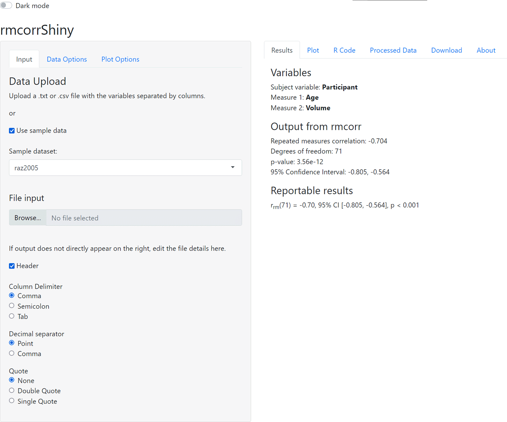 • The display of raw data and the output from rmcorr as well as formatted output for reporting scientific results.