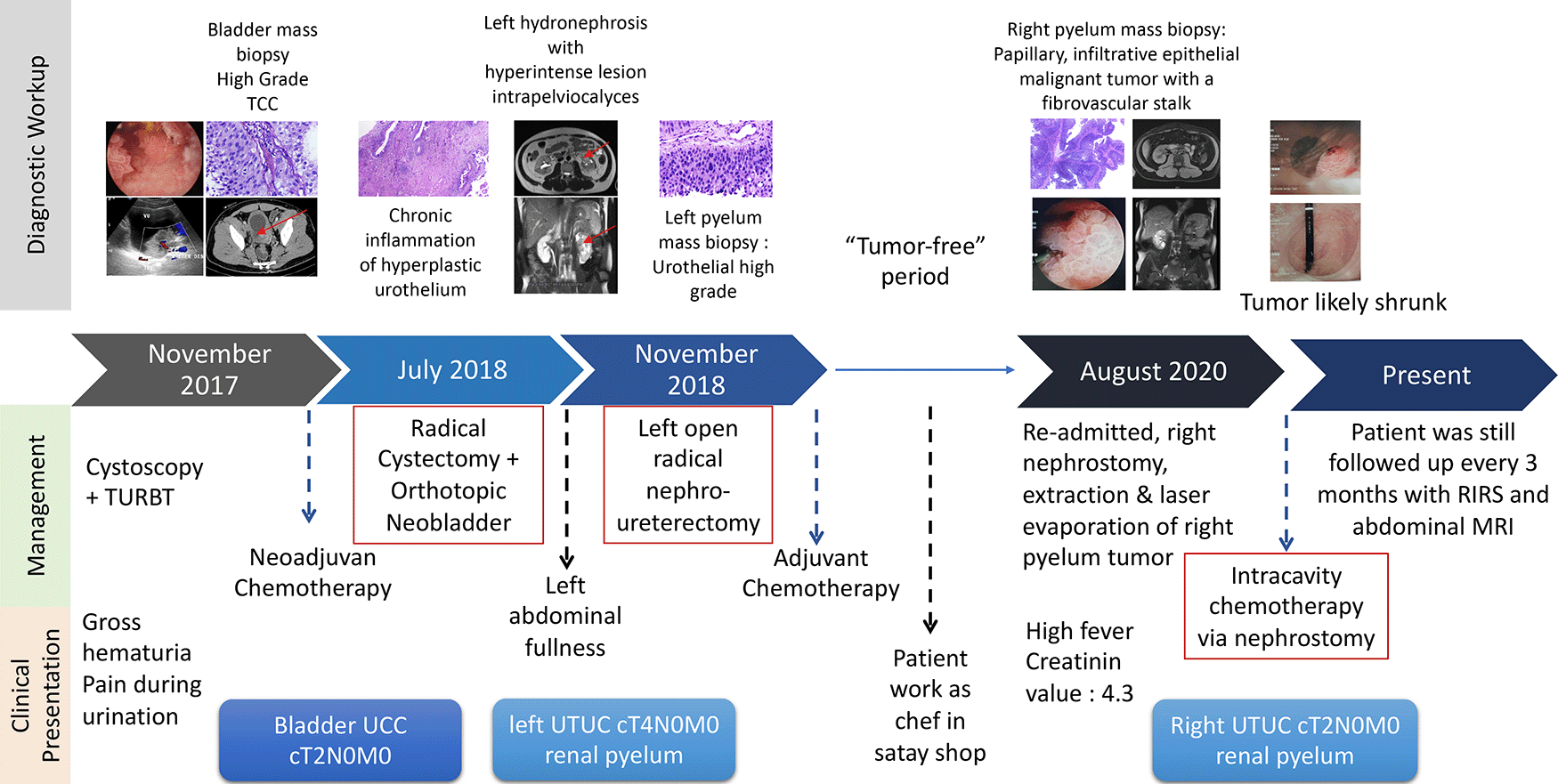 The patient is an Indonesian male born in 1978 who works as a cook. He was admitted to Ciptomangunkusumo National Hospital (RSCM) in November 2017 with gross haematuria as the chief complaint. The patient’s timeline is shown in Figure 1.
