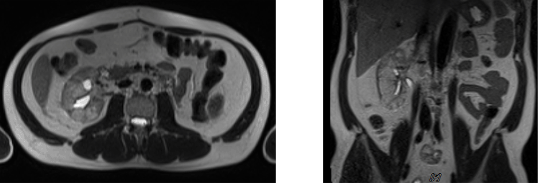 The patient was given intracavitary chemotherapy using gemcitabine through nephrostomy. Furthermore, cystoscopy intracavitary instillation of chemotherapy agent using gemcitabine was administered through nephrostomy. The examination conducted in September 2020 showed a normal right kidney with no hydronephrosis, but there was a sign of intraluminal neobladder clotting. The patient then went to a clot evacuation cystoscope, and the last cycle of intracavitary gemcitabine was given in November 2020. Furthermore, an MRI and ureterorenoscopy were conducted and the mass was shown to be decreased. Abdominal MRI in May 2021 showed benign calyx dilatation suspicious due to stricture and heterogeneous renal parenchyma (Figure 5).