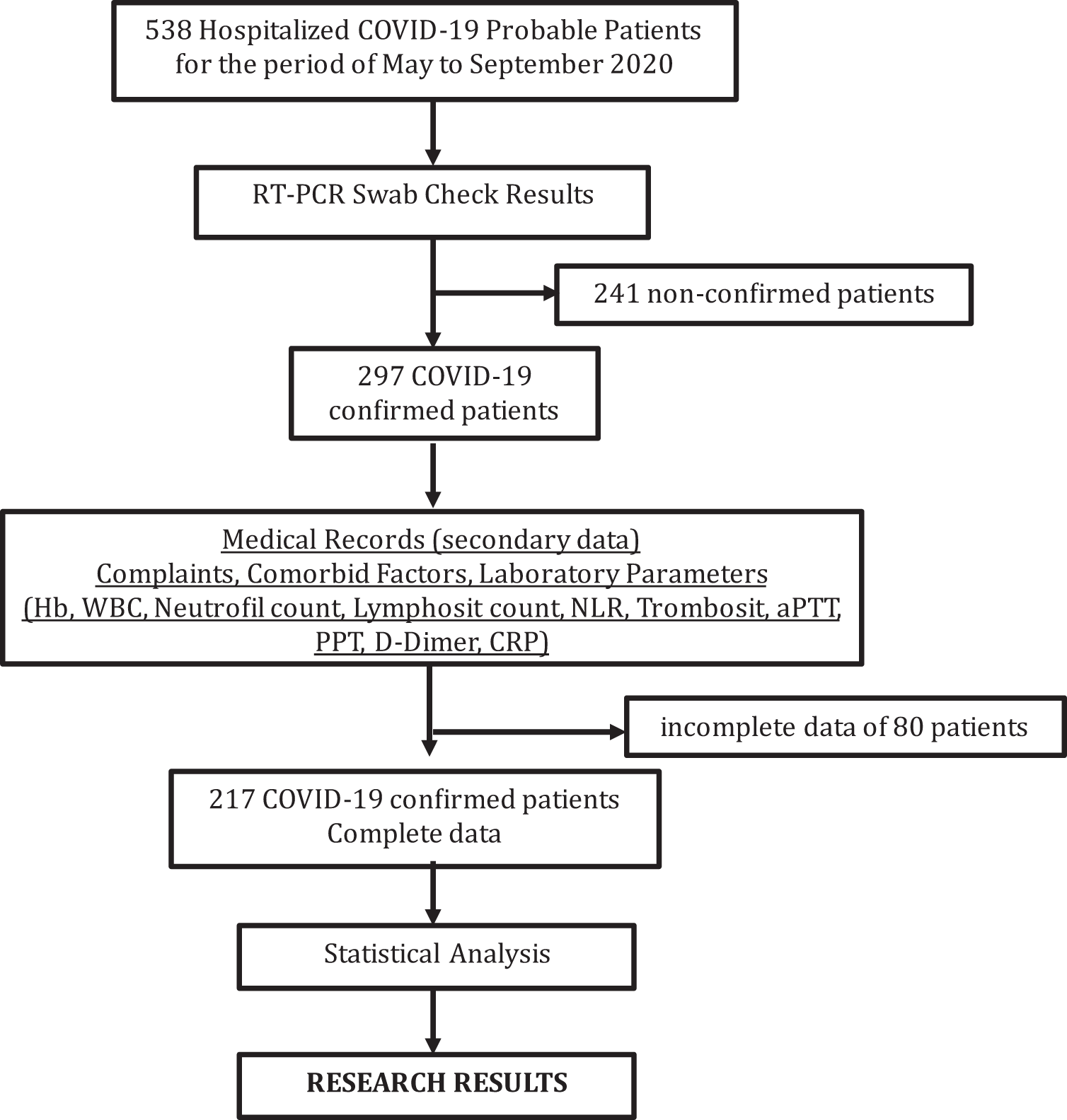 This was a retrospective analytical study, performed by taking secondary data on patients with probable COVID-19 cases who were treated at the special isolation room (non-intensive care) of the Department of Internal Medicine of the teaching hospital of RSUD Dr. Soetomo between May and September, 2020. The sample consisted of deceased and survived patients at the special isolation room (non-intensive care) of Internal Medicine of RSUD Dr. Soetomo, who had been hospitalized with probable COVID-19. The inclusion criterion was hospitalization with probable COVID-19 in patients who were more than 18 years old. The exclusion criterion was incomplete care clinical data. This research began with sample selection including all COVID-19-probable hospitalized patients (a total of 538 probable cases); then a diagnosis of COVID-19 was examined using reverse-transcription polymerase chain reaction (RT-PCR), carried out through nasal swab. RT-PCR results showed 297 patients were positive (55.2%) and 241 patients were negative (44.8%). Of the 297 positive patients with COVID-19, 80 patients had incomplete medical record data, therefore, 217 patients met the inclusion criterion and were included in the study (see Figure 1).