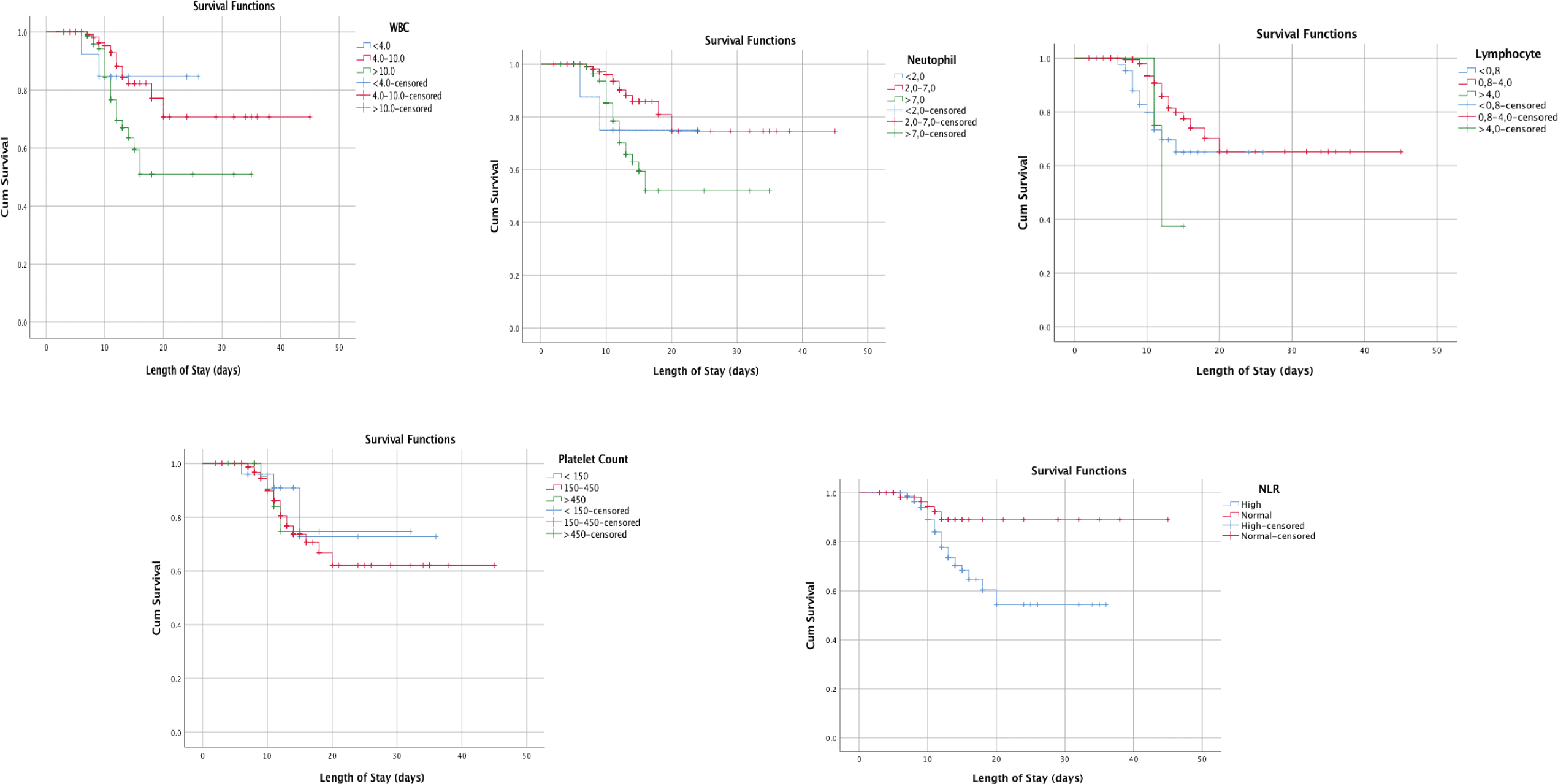 The Kaplan–Meier graph showed that there was a significant association between mortality and leukocyte count, neutrophil count, NLR, PT, and CRP (p < 0.05, respectively) (see Figure 2). Lower survival rate was shown from leukopenia, leukocytosis, neutrophillia, high NLR, high CRP, and prolonged PT (p = 0.015; p = 0.018, p = 0.003, p = 0.035, and p = 0.03, respectively).