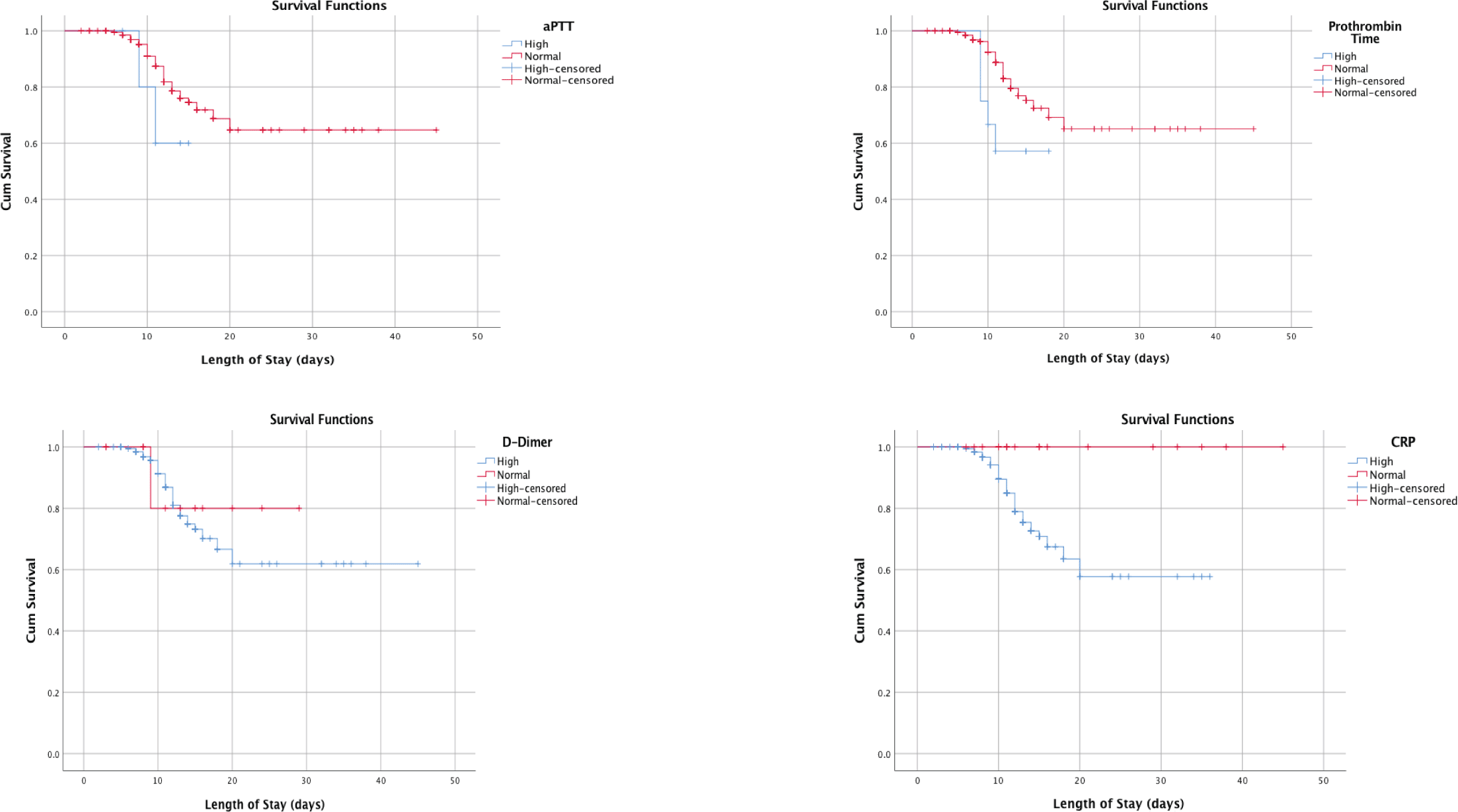 We included age (as a categorical variable of under and over 65 years old), presence of chronic kidney disease, diabetes mellitus, coronary heart disease, and indicators, such as WBC count, NLR, CRP, PT, aPTT, and D-dimer for determining the predictors of mortality. In the univariate analysis, the independent predictors of mortality were shown from presence of chronic kidney disease, diabetes mellitus, coronary heart disease, WBC count, NLR, and PPT. However, based on the Cox multivariate regression analysis, only coronary heart disease significantly became the independent predictor of mortality (see Table 4).
