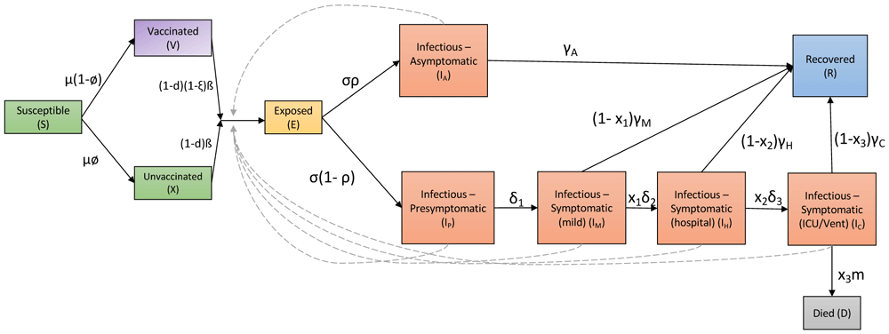 Here we develop an extended SEIR model to assess population-level disease dynamics of COVID transmission. We consider a population of fixed size that we divide into eleven interacting sub-populations: susceptible without access to a vaccine (S), vaccinated susceptible (V), unvaccinated susceptible (with access to a vaccine) (X), exposed but not infectious (E), asymptomatic infected (Ia), pre-symptomatic infected (Ip), mildly symptomatic infected (Im), hospitalized infected (Ih), critical care infected (Ic), recovered (R), and died (D). Since the population size is fixed, we can impose the condition that S + X + V + E + Ia + Ip + Im + Ih + Ic + R + D = 1, and each population can therefore be interpreted as a proportion of the total population.