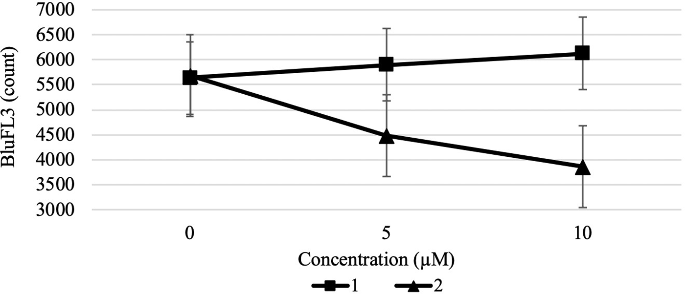 A statistically significant difference in chlorophyll fluorescence was observed between cc4425 and cc5013 (6,127 and 3,858 counts respectively) at 10 μM Cd (Table 1, Figure 1). However, at the control treatment and at 5 μM treatment, cc4425 and cc5013 chlorophyll signals at BluFL3 were not statistically significantly different from each other (Figure 1). It is interesting to note that as the Cd concentration increased, chlorophyll intensity increased for wild-type strain cc4425, while chlorophyll intensity decreased for cia7- mutant cc5013 (Figure 1). This negative trend in chlorophyll intensity level might be indicative of heavy metal toxicity, to which cc5013, whose Cia7 gene has been disrupted, might be more susceptible, including Cd susceptibility, compared to the wild-type cc4425.