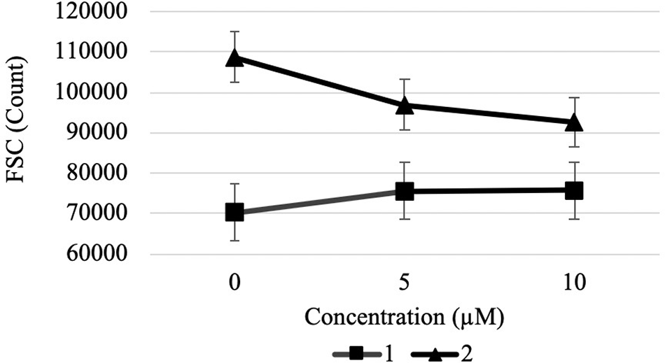 Cell size was determined as a function of the forward scatter signal (FSC) (Figure 2). A similar empirical trend in the strains was observed in cell size as measured by the FSC. The effect of Cd on cell size was determined to be statistically significant between strains (p < 0.0001) at all concentrations (Table 2, Figure 2). The mutant, cc5013 was observed to have greater cell size than wild-type cc4425 especially under 0 μM Cd2+. Although not statistically significant (p > 0.05), cc4425 showed an increase in cell size with increase in cadmium concentration, while cc5013 showed a decrease in cell size (Figure 2).