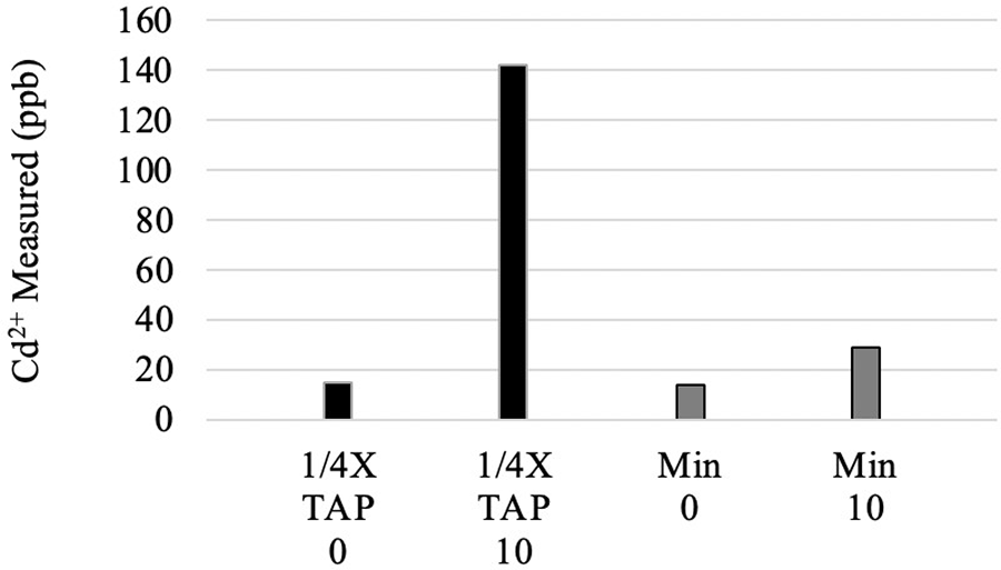 On the other hand, a statistically significant difference was determined in the media by concentration effect (p < 0.0001) (Table 4). There was a significant difference in cells’ bioaccumulation of Cd2+ in 10 μM Cd (1830 ppb) treated ¼ X TAP (142.22 ppb) when compared to Cd2+ bioaccumulation in Min (28.88 ppb). On the other hand, as expected, there was no significant difference between ¼ X TAP and Min (14.53 ppb and 14.44 ppb respectively) at 0 ppb Cd (Table 4 and Figure 3). The main difference between the two media is the presence of acetate and phosphate in ¼ X TAP and their absence in Min. The pH of the two media were adjusted to pH 7.0. As previously mentioned, the TAP medium was diluted by a factor of ¼, as phosphorus has been reported as reducing the bioavailability of free metal ions due to its chelating character (Olanarin et al., 2013).