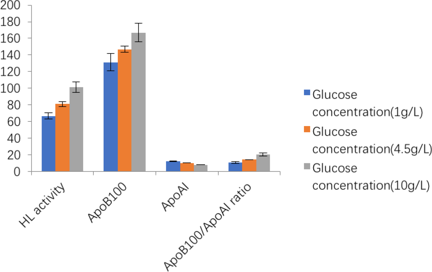 As shown in Table 1 and Figure 1, significantly increased HL activities were observed with the glucose concentration increase (1 g/L < 4.5 g/L < 10 g/L). ANOVA showed that the differences are significant (p < 0.001).