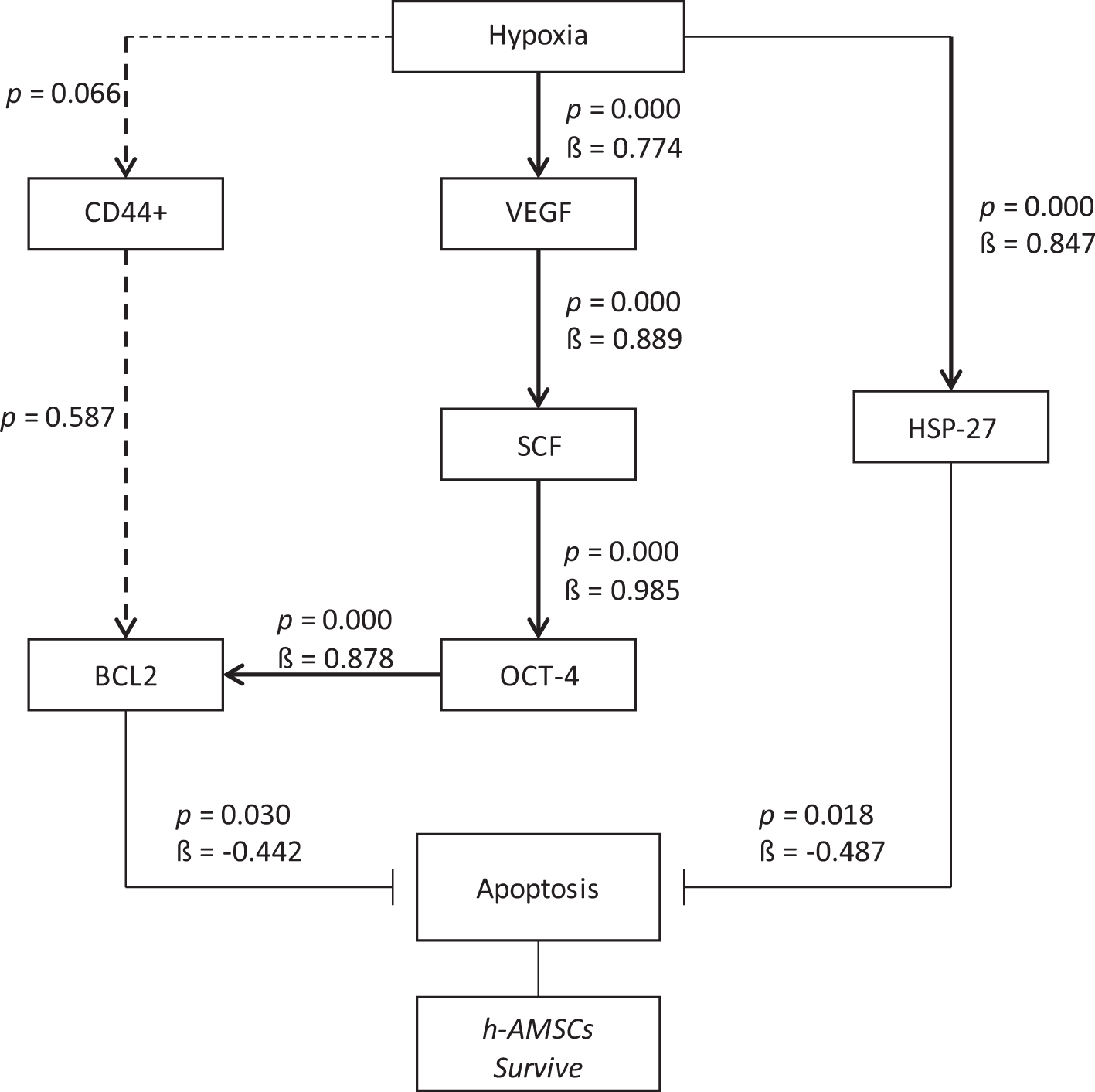 From this study, it can be concluded that the hypoxic preconditioning affect the survival of h-AMSC with different apoptotic presentations due to the increased expression of BCL2 (anti apoptotic protein) and HSP 27 as chaperone proteins that play a role in inhibiting apoptosis. In this study, the hypoxic preconditioning may elevate the expression of studied variables, such as the number of apoptosis through BCL2 and HSP27 expression, trigger signal through VEGF expression, proliferation through SCF expression, and multipotency through OCT-4 expression. Hypoxic preconditioning significantly affects VEGF, VEGF affects SCF expression, SCF affects OCT-4 expression, OCT-4 affects BCL2 expression, but hypoxia also affects HSP27 expression. BCL2 and HSP27 have proven inhibiting apoptosis thus enhancing h-AMSCs survival (Figure 10). In conclusion, hypoxic preconditioning of h-AMSC culture has proven to increase the expression of VEGF, SCF, OCT-4, and BCL2 and HSP27. This study demonstrated and explained the existence of a new mechanism of increased h-AMSC survival in cultures with hypoxic preconditioning (O2 1%) via VEGF, SCF, OCT-4, BCL2, and HSP 27. But CD 44+ did not play a role in the mechanism of survival improvement of human AMSC survival.