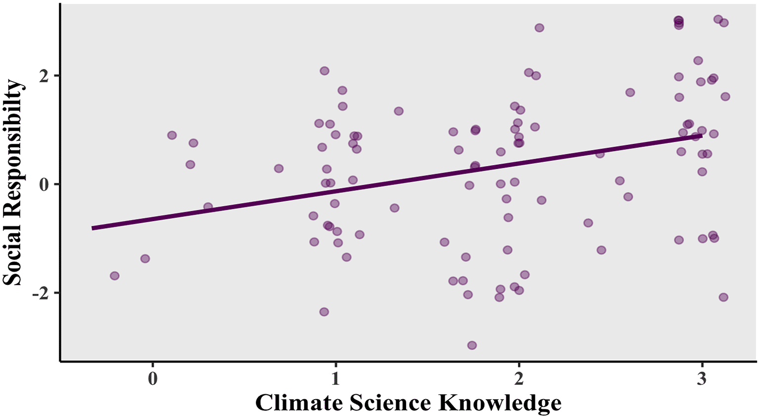 There was a noticeable relationship between the variables making up environmental awareness at the corporate level: “climate science knowledge” and “corporate social responsibility”. As shown in Figure 2, a positive correlation was found, Pearson’s product-moment correlation R = 0.309, 95% confidence interval (CI) = 0.124-0.473, t(102) = 3.282, p = 0.0014.