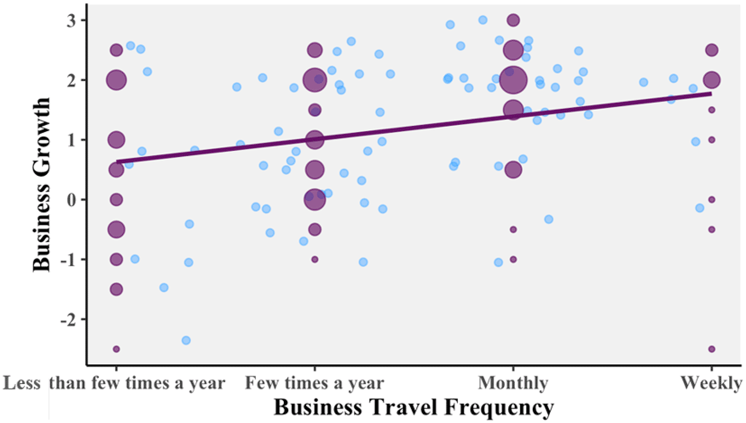 Figure 4 is a scatterplot showing one blue point for each of the respondents, based on which of the four options they chose for travel frequency and their judgment of how important travel is to their business growth. There is random jitter added to the graph, so that each point is visible. The purple dots show the average number of people at each possible response by their size. The purple line shows the linear relation between the two variables. Analysis of this supports hypothesis 1, as there is a significant and positive correlation. Pearson’s product-moment correlation R = 0.299, 95% CI = 0.113 – 0.465, t(102) = 3.164, p = 0.002053.