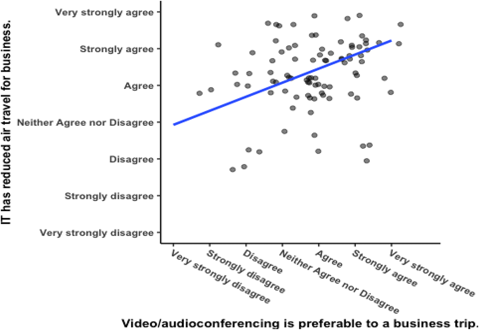 While the COVID-19 pandemic has seen a huge drop-off in air travel, there are indications that many businesses intend to resume travel in the near-term. However, as has been argued in many fields, this may provide a one-off opportunity to reset travel on a more sustainable footing, and to break the hold that travel has over business culture (Koonin, 2020; Hepburn et al., 2020; Kuzemko et al., 2020). The current normal is remote, and in some areas, it is allowing equivalent if not superior functionality to in-person communication (Clopper, Baccei, & Sel, 2020). The potential for an increased use of technology to replace travel has been building for a decade or more (Julsrud, Denstadli, & Hjorthol, 2014). It may now be realized.