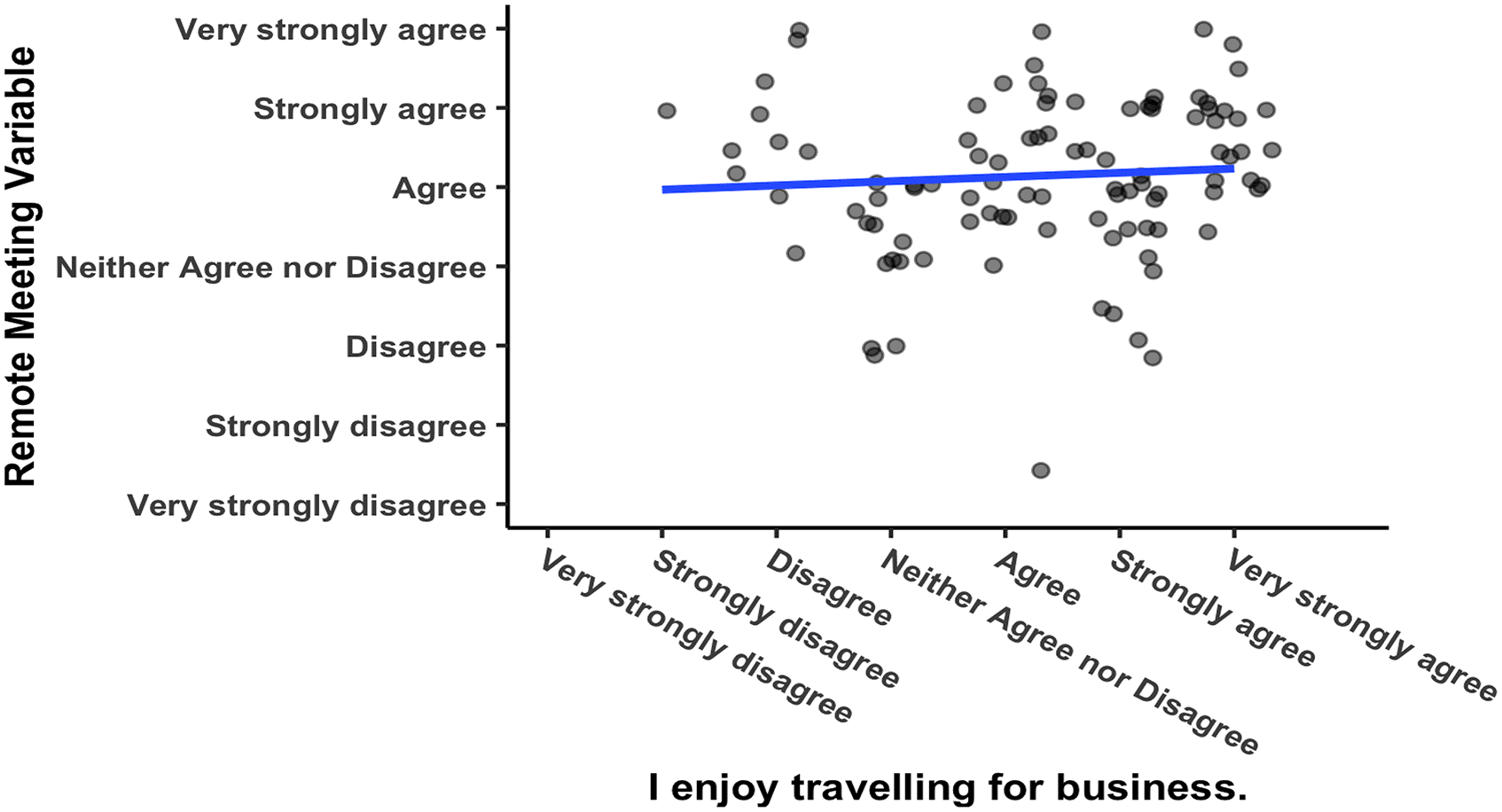Figure 5 shows a significant positive correlation between responses to the two questions that were asked regarding corporate culture (see Table 1 for the questions), with Pearson’s product-moment correlation R = 0.51, 95% CI = 0.282 – 0.592, t(102) = 5.1003, p = 0.000002. Respondents from corporations with a meeting culture that emphasizes meeting face-to-face would be expected to report greater enjoyment of business travelling. For one, they were hired by the corporation, so they are likely to embody the culture to begin with. Secondly, as mentioned above in the method section, spending time in a culture in which business travel as a norm makes it more likely that someone will believe they enjoy business travel. The researcher compared the responses to this question against the variable “remote meeting” and found that they were not significantly correlated (see Figure 6), Pearson’s product-moment correlation R = 0.062, 95% CI = −0.133 – 0.253, t(102) = 0.626, p = 0.533. Enjoyment of business travel and a preference for videoconferencing are two separate constructs.