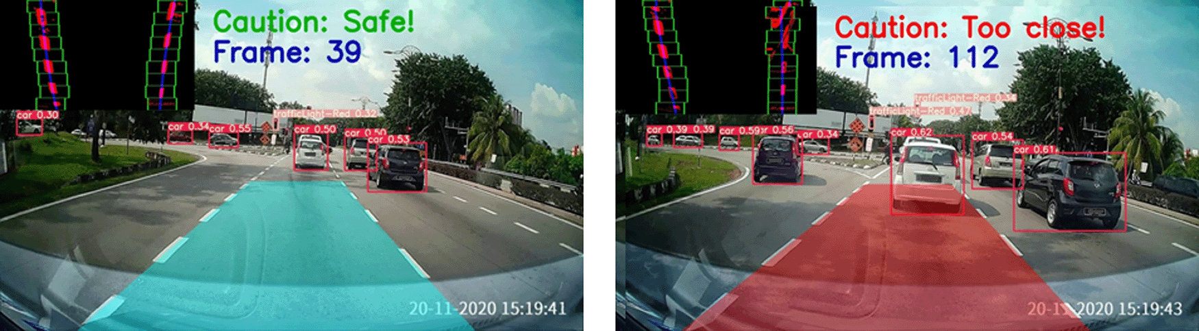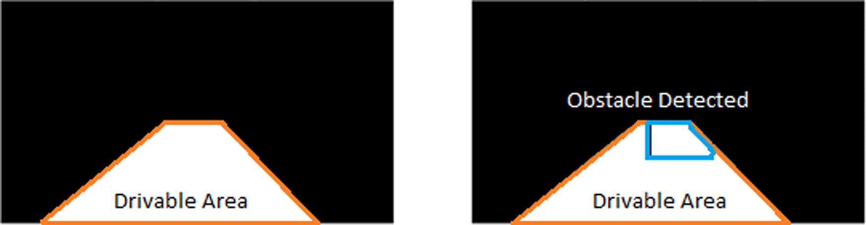 where refers to the bounding box region for the detected obstacle on the ego lane. Figure 10 displays the safe drivable area (on the left) and an obstacle superimposed on the drivable area (on the right). A warning will be issued in the case when the obstacle is detected on the ego lane drivable area. Some samples of the proposed method are presented in Figure 11.